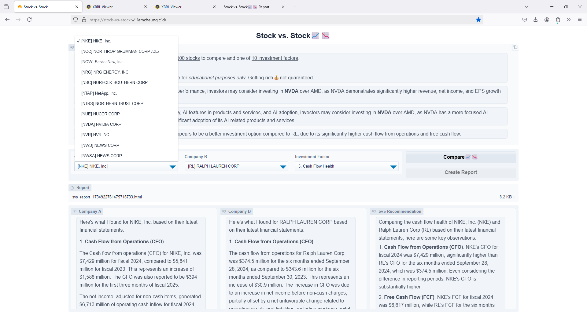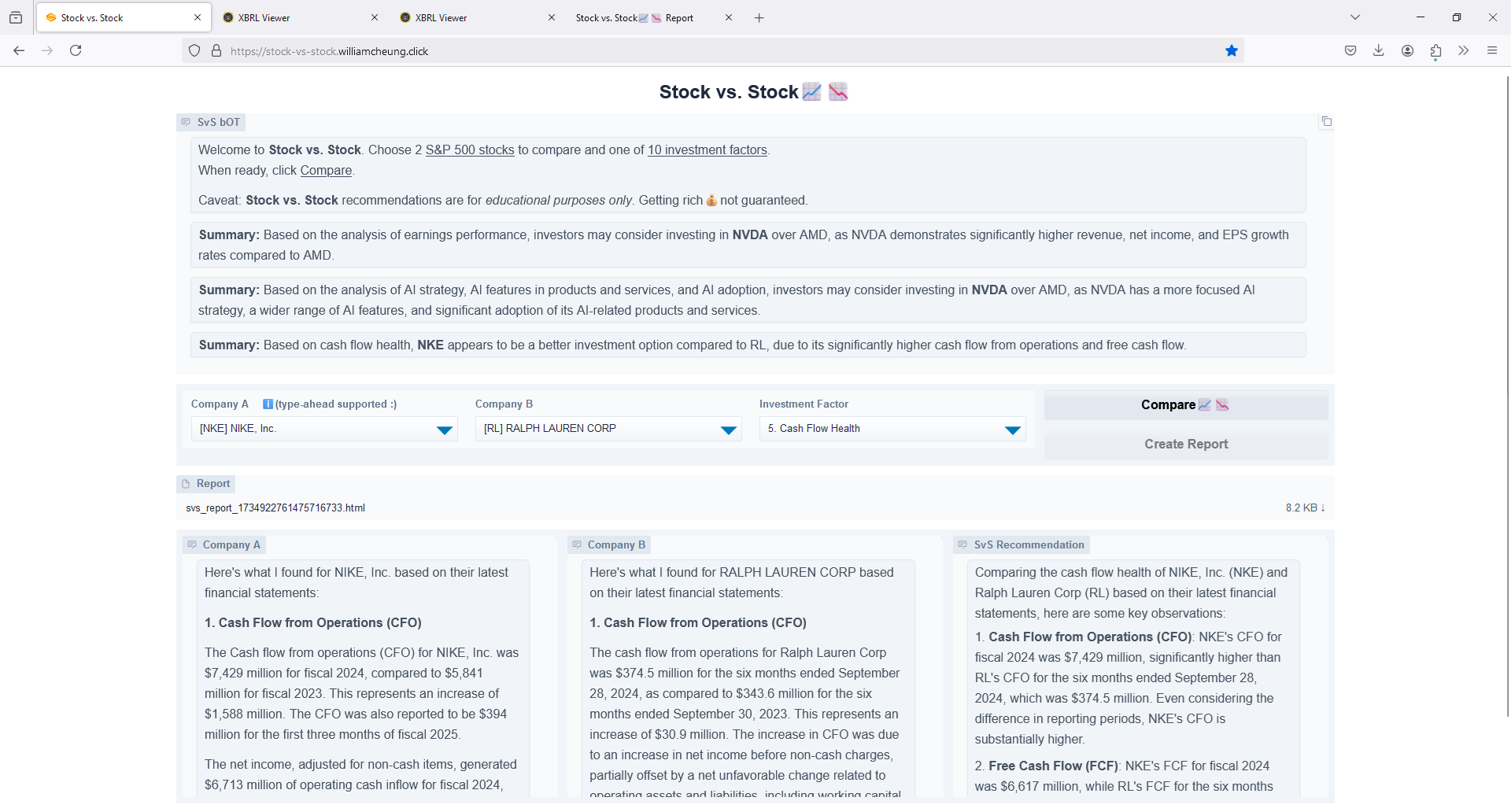 There has been debate about the trustworthiness of AI generated investment recommendations. By grounding the recommendations in the official and public financial statements of US traded companies, I tried to mitigate the risk of LLM hallucinations. At the very least, Stock vs. Stock will clearly improve users' financial literacy about investing in big companies like the ones in the S&P 500.