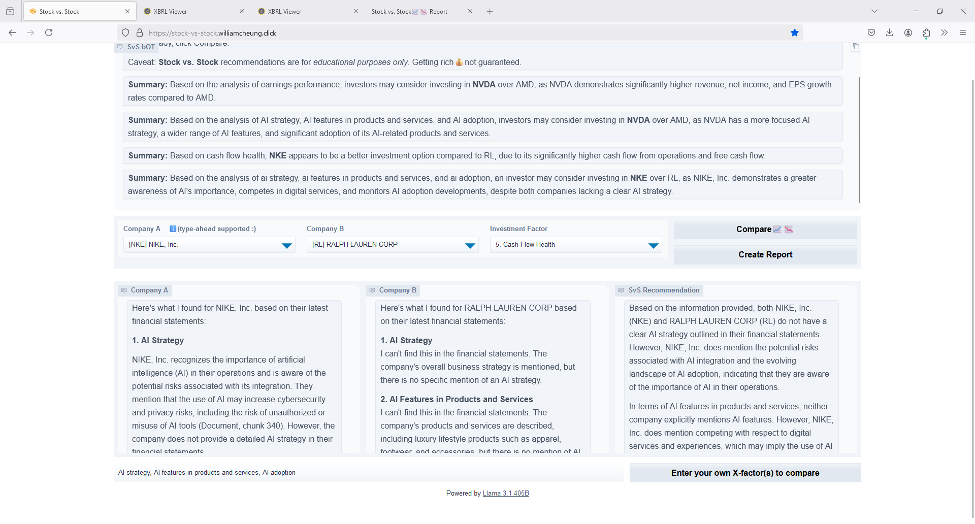 Stock vs. Stock uses Meta's Llama 3.1 405B open source LLM to compare any pair of S&P 500 stocks based on a top 10 investment factor and gives an investment recommendation. The comparison is based on doing RAG (Resource Augmented Generation) with the 2 companies' recent 2024 financial statements (8-K, 10-K, 10-Q) filed with the SEC, which are embedded using OpenAI Embedding as vectors in TiDB vector database. Also, a summary of the whole analysis and an optional report are generated by Llama. The user can also enter their own custom investment factors to do the stock vs. stock comparison, such as comparing AI strategy.