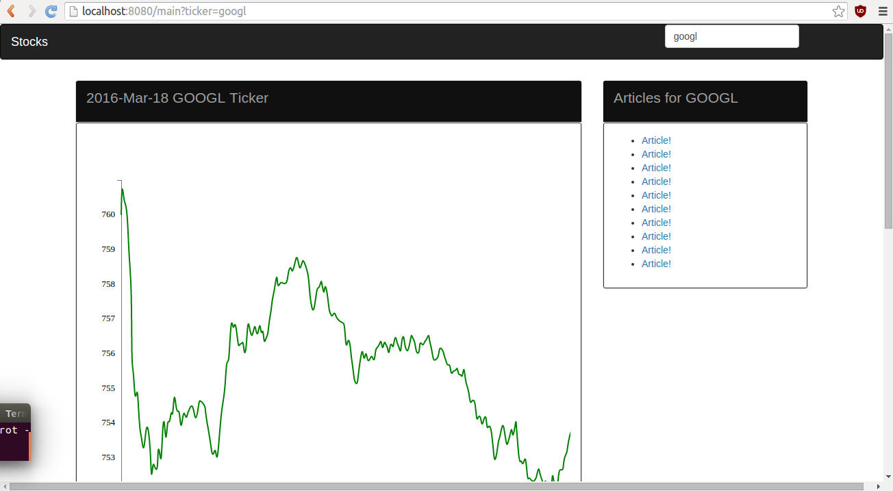 We used Go to connect to our Postgresql database that had historic stock data. We created an API that our web front end could pick up and graph that data using d3.js. Then we built a web crawler to find articles for companies to use as training data for our bag of words algorithm. The web front end was made in Go/HTML/CSS/JS and was using REST to connect to the API backend. We hosted the database on Digital Ocean to make it easier for all of us to get the data.