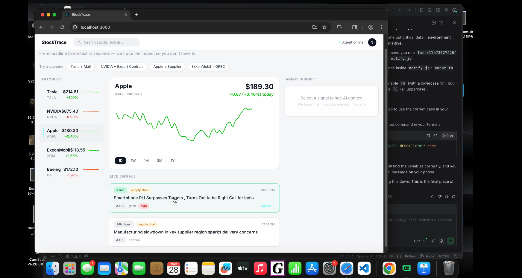 Most stock alert tools tell you what happened — they never tell you why. StockTrace is an AI-powered messaging agent that watches your watchlist around the clock, detects meaningful market and news events, traces the impact through a supply chain knowledge graph, and delivers a plain-English explanation directly into your messages — before you even have time to wonder.