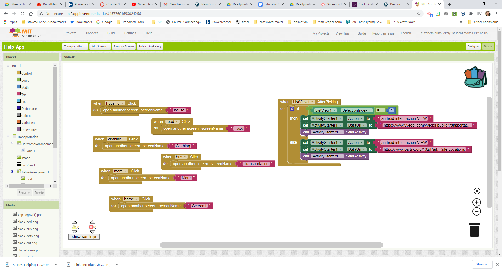 Quentin coded the project in MIT App Builder. Madison created the icons for the navigation bar. Anakin drew the logo. Samantha drew the graphics online for two of the screens. Anastazia drew the graphics for one of the screens and researched poverty statistics. All team members researched organizations that provided transportation or food pantry and thrift stores as well as low income housing. We also researched low fee banks, mental health services and animal shelters.