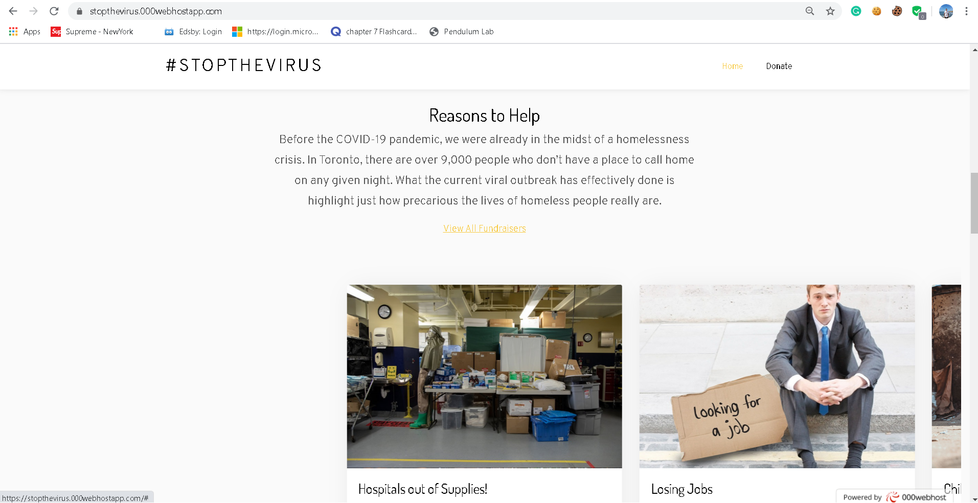 I learned that we all have our part in helping #STOPTHEVIRUS. Most of us are sitting at home practicing social distancing, so it feels like we are not doing much, but we are. I wanted to do something from my home that can help people, which was to create a donation and information giving website.