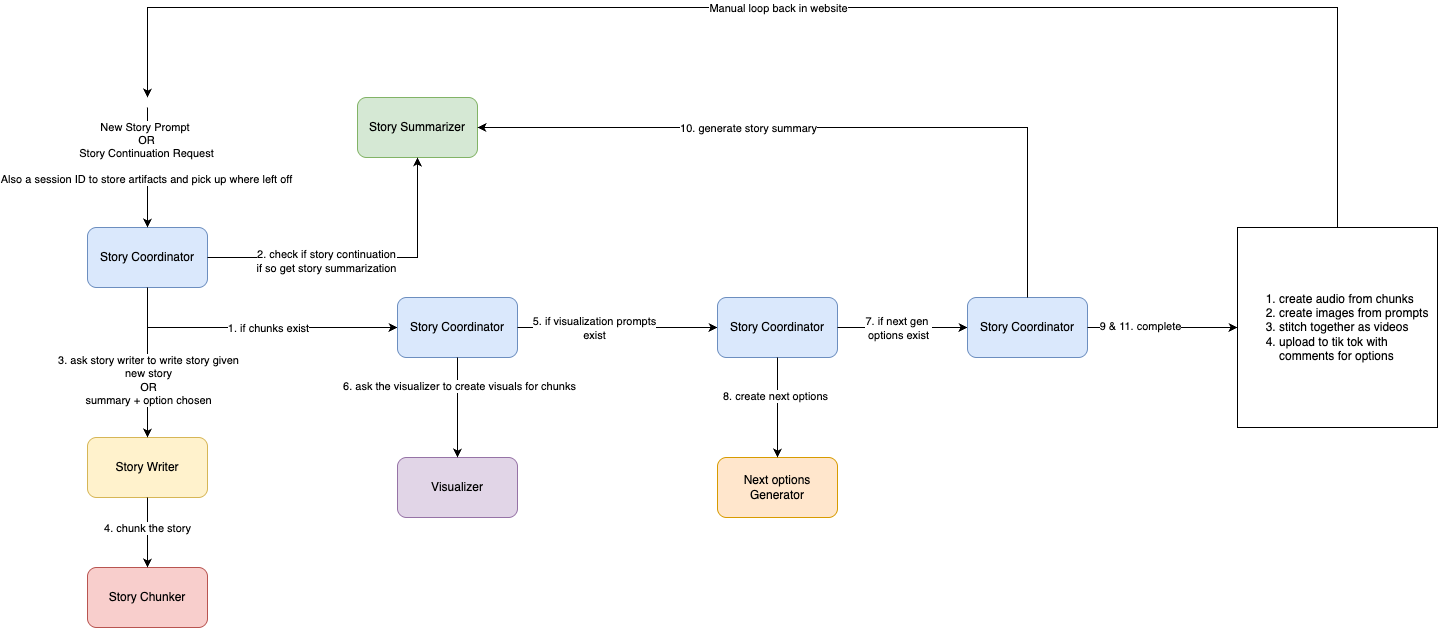 We used google's ADK to handle the agent orchestration, among several sub agents for writing story, summarizing the story so far, generating next options and image prompt generation. We made sure the agents stored artifacts (and checked artifacts for the story id) in firebase along the way so a failed in flight generation could be restarted from where it failed. Once the image prompts, text chunks, next options and summary are generated by our agent team, we used gemini's TTS (falling back to gtts if throttled) to generate audio and used gemini image generation to create the images. The final video is composited together using moviePy and all artifacts and metadata are stored in firebase.