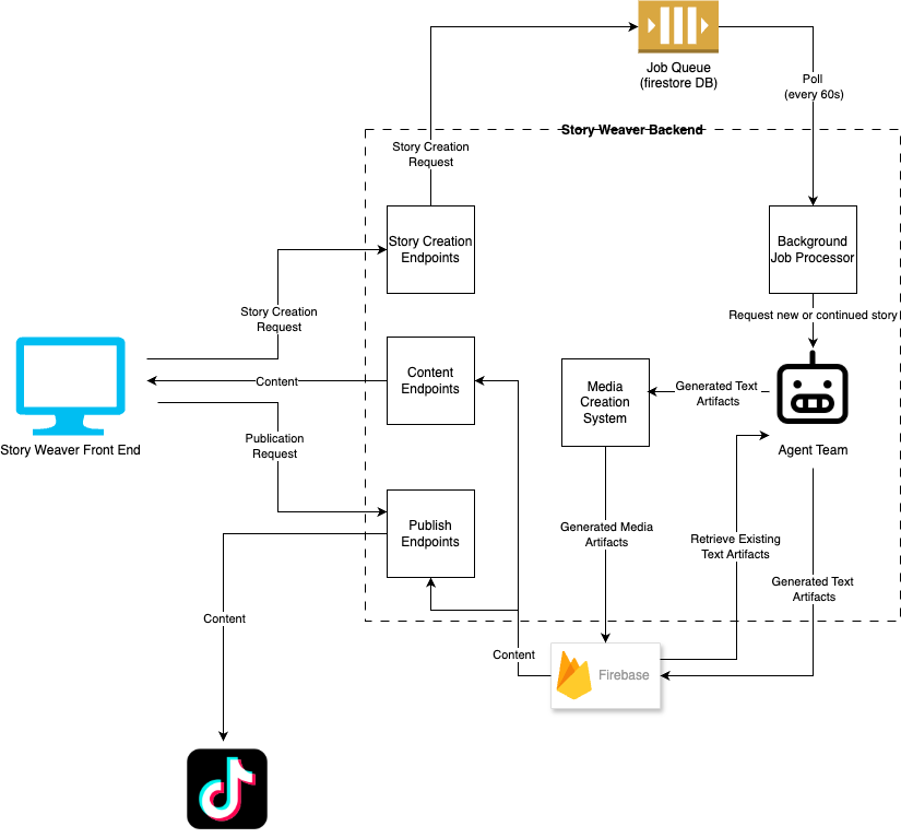 Story Weaver allows creators to short 60 second video episodes by leveraging a team of agents. You provide the audience, genre and POV and the agent team will handle the story progression, images and audio. Story Weaver is built around crowd funding the story arc, creators will upload the content to their favorite platform (currently in the progress of onboarding TikTok) and let their viewers select from AI generated next options. The summary of the story so far and the chosen option is then fed back to the agent team to create the next chapter in a never ending quest.