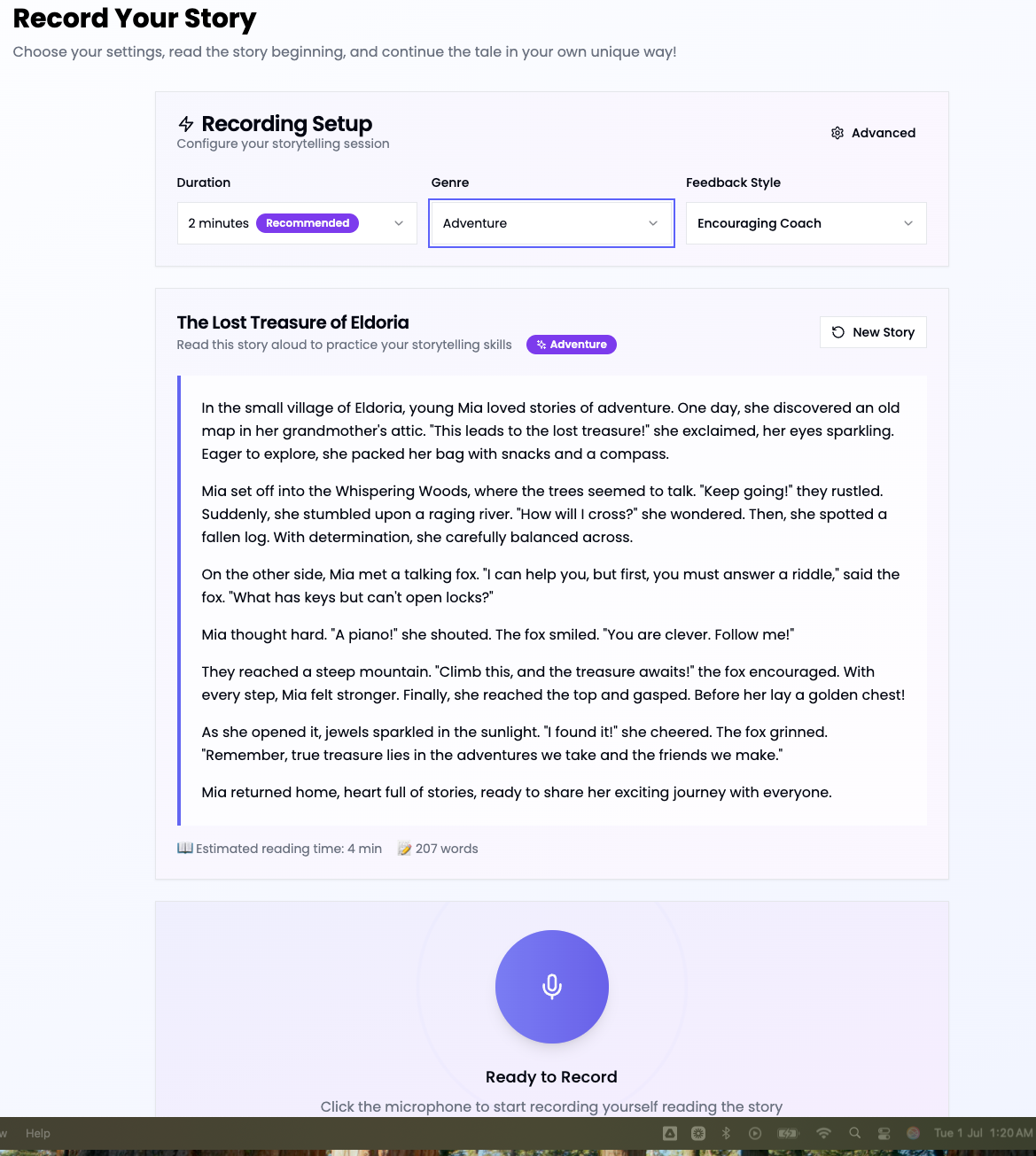 The app captures natural speech patterns and provides constructive, actionable feedback to help users improve their narrative skills consistently.
