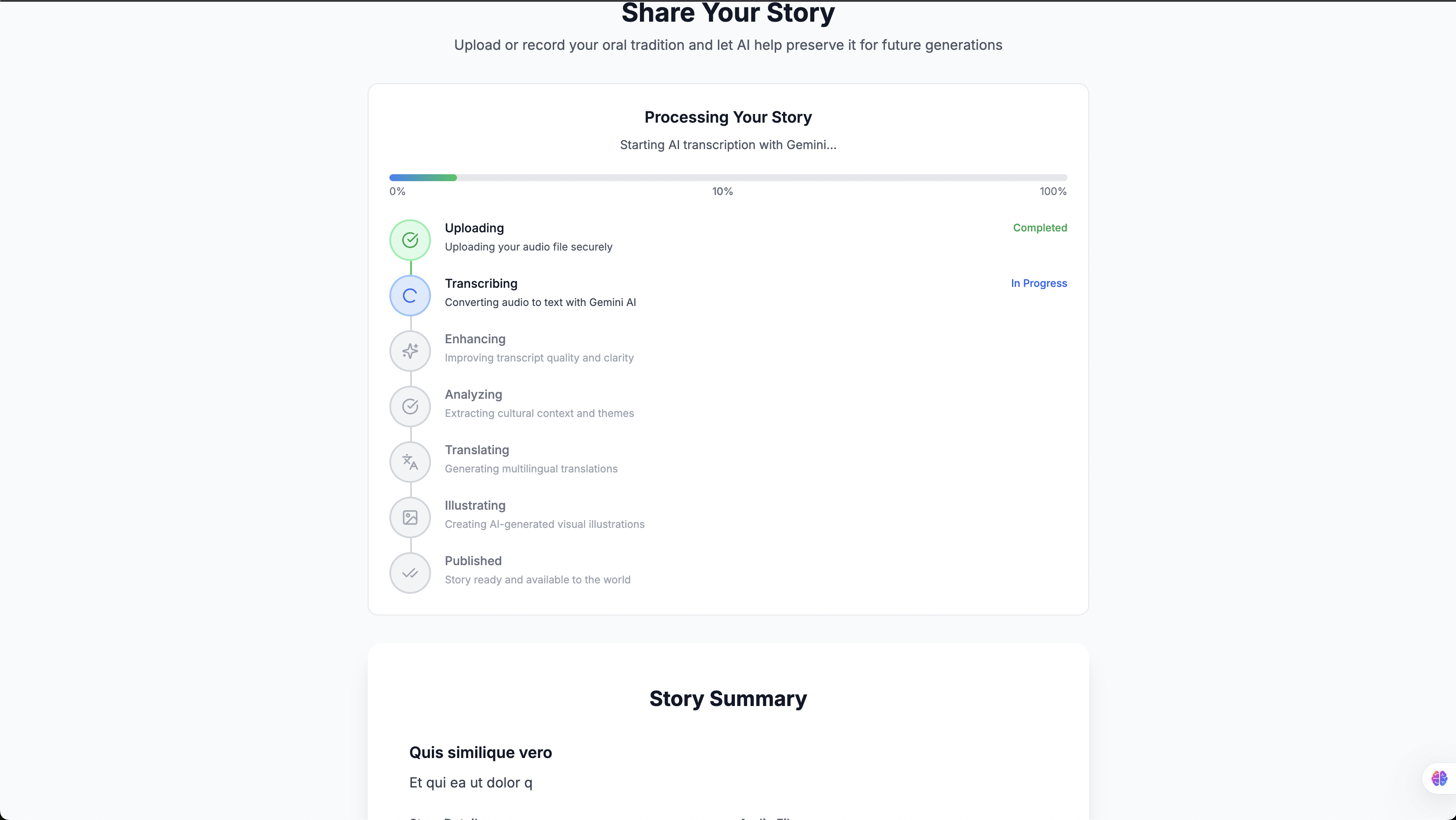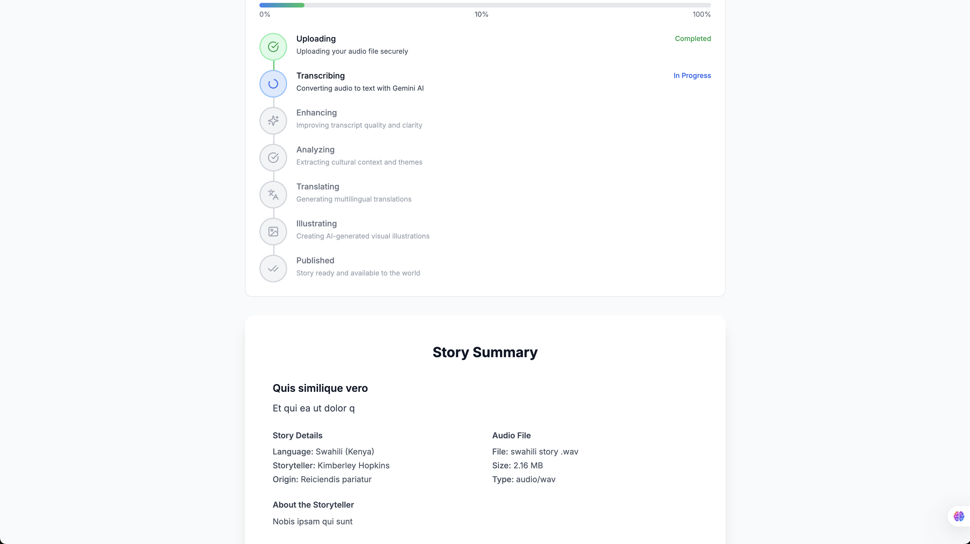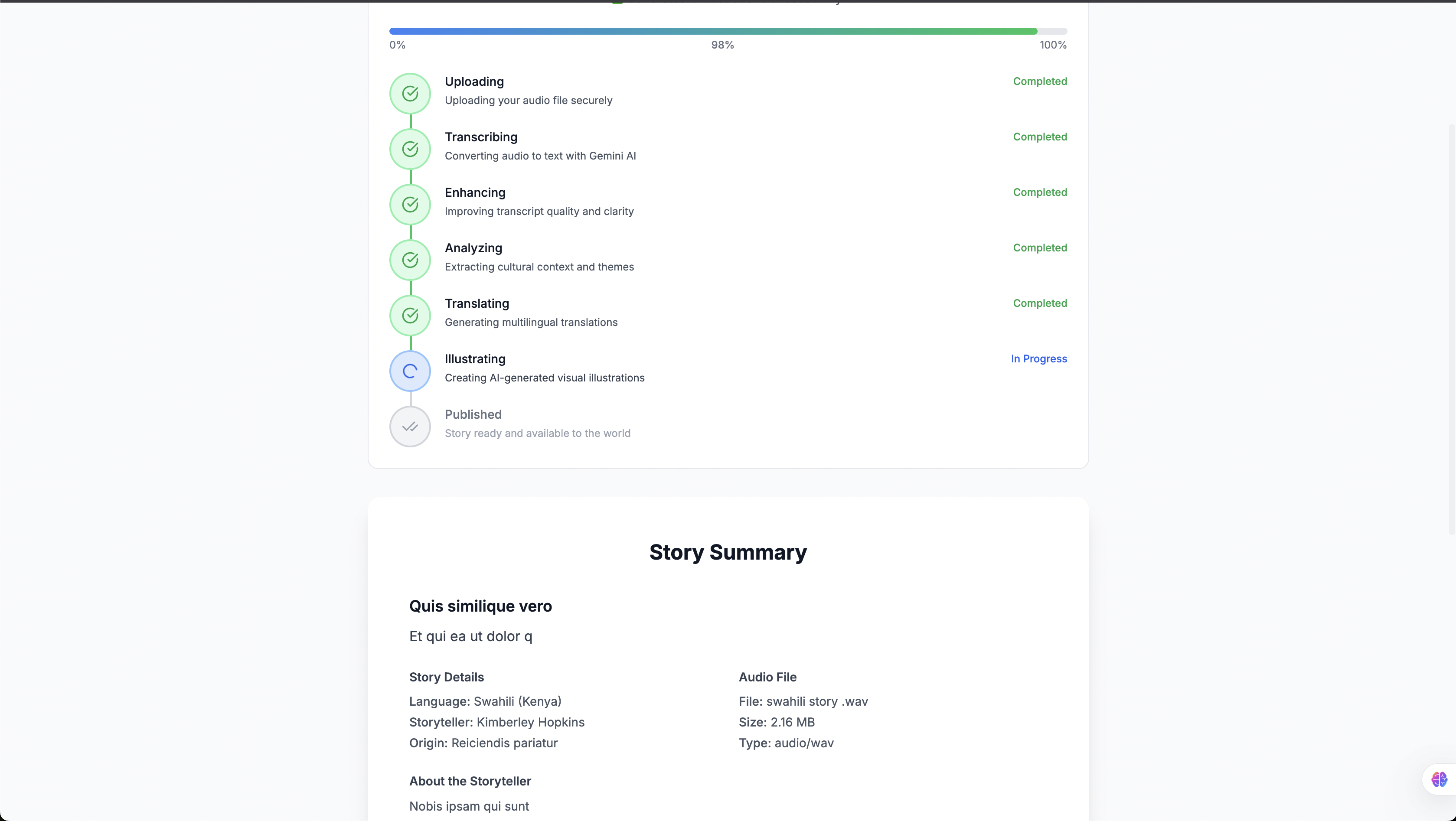 - Audio Processing: Upload and process stories in multiple audio formats with intelligent quality assessment