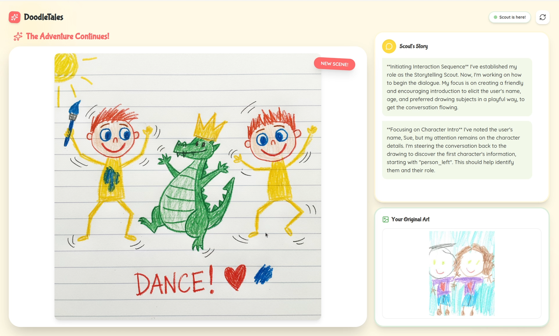 - Multimodal Adventure: A voice-enabled "Storytelling Scout" engages the child in a conversation. The Scout asks about the characters' names, ages, and roles, reacting dynamically to the child's voice and the drawing itself using Amazon Nova 2 Pro's multimodal capabilities.