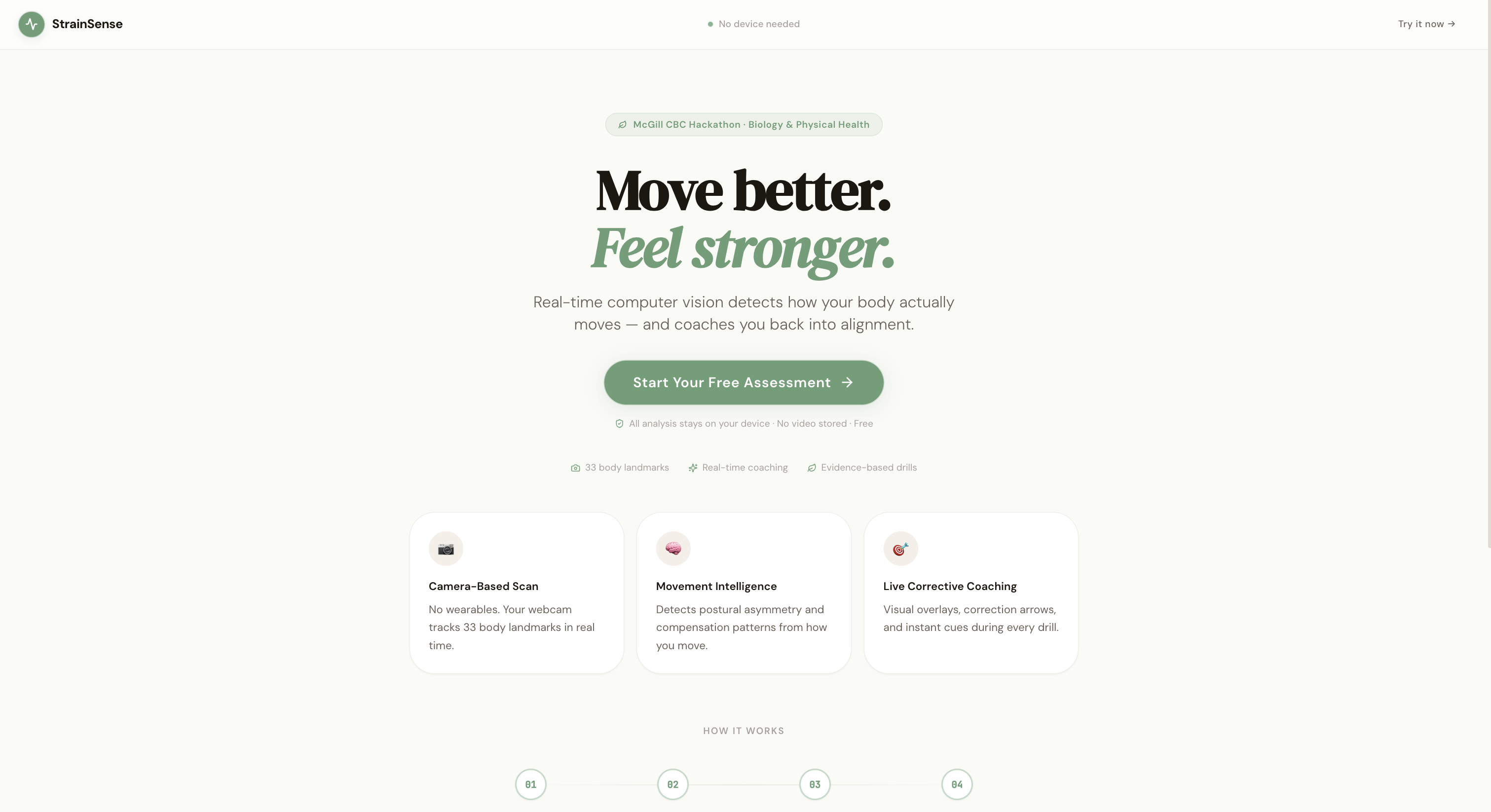 StrainSense guides the user through a short camera-based movement assessment, including stance and movement checks, then analyzes their body in real time using pose landmarks.
