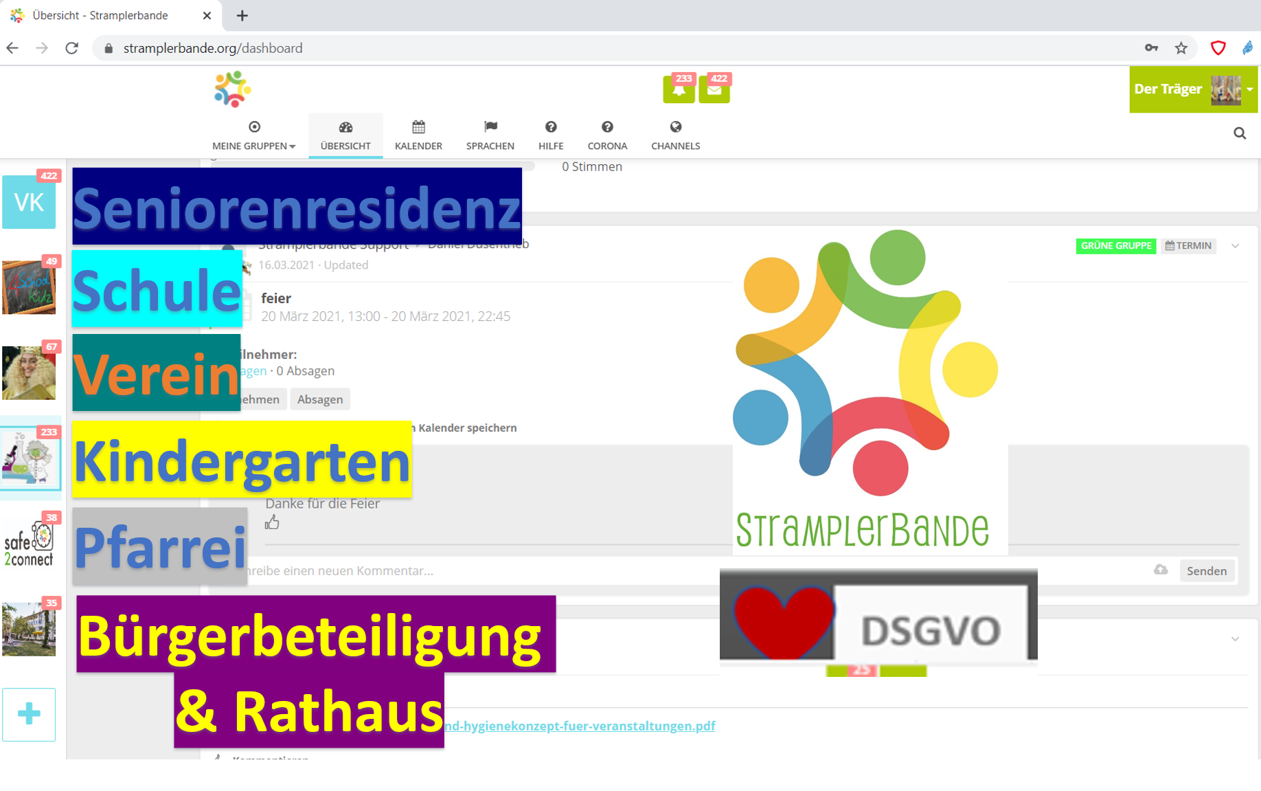 Mit unserer App „Stramplerbande“ vernetzen wir Erziehende und Eltern mit- und untereinander und das einfach, DSGVO-konform und mit allem, was die moderne Welt zu bieten hat. Mit Funktionen, wie Push-Nachrichten, Kalendermodul, automatischer Übersetzungsfunktion für die Integration fremdsprachiger Familien, Empfangsbestätigung, Krankmeldefunktion, Video- und Bildupload und vielem mehr enthält die App alle Funktionen, die Menschen auf digitalem Weg miteinander verbinden und so ein starkes Miteinander entstehen lassen. Alle Funktionen sind dabei nach dem Baukastenprinzip entwickelt und können frei integriert werden.
