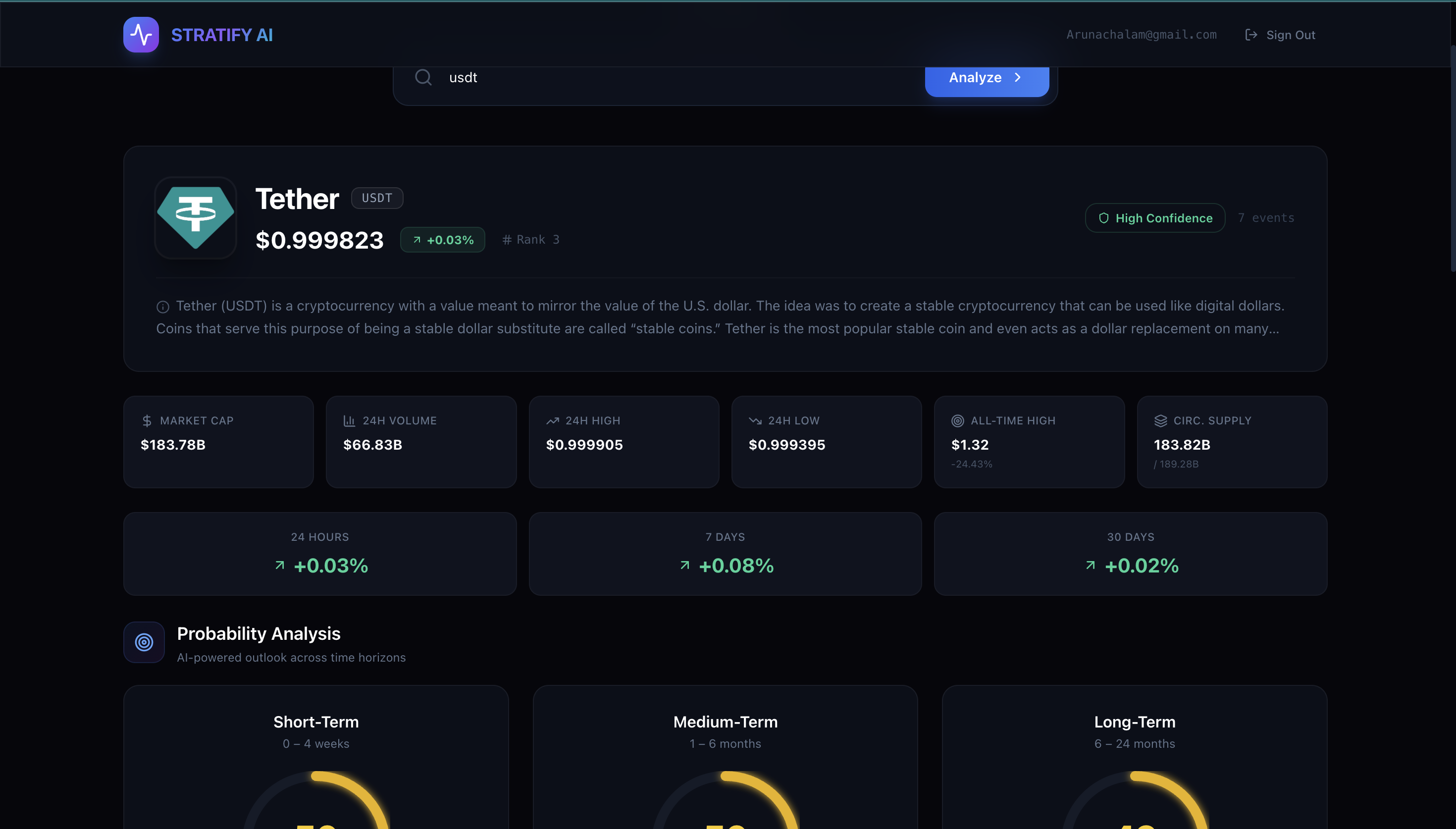 Stratify AI was inspired by a fundamental gap I observed in the cryptocurrency ecosystem. Most platforms focus heavily on technical indicators price charts, RSI, MACD, and short term momentum signals but they rarely connect crypto markets to the broader macroeconomic environment. However, real financial markets are deeply influenced by central bank policies, inflation data, geopolitical tensions, and regulatory shifts. For example, when the Federal Reserve adjusts interest rates, liquidity conditions change across global markets, and risk assets including cryptocurrencies respond accordingly. Yet popular crypto data platforms like CoinGecko and CoinMarketCap primarily display price and volume data without quantifying macroeconomic impact. I was motivated to build a system that bridges this gap one that not only tracks crypto prices but also interprets how macro forces probabilistically influence digital assets across different time horizons.
