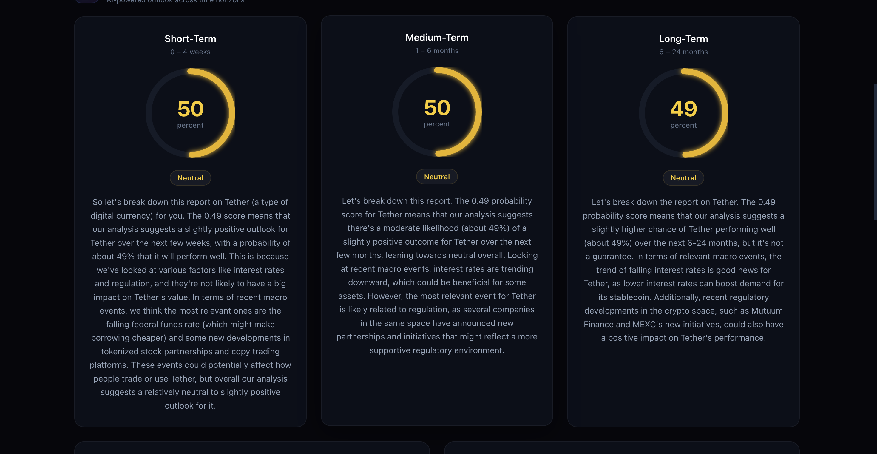 One of the biggest challenges was converting abstract macroeconomic concepts into measurable computational signals. Variables such as geopolitical risk and regulatory exposure are inherently qualitative, requiring proxy metrics like sentiment analysis and weighted jurisdiction scoring. Designing a fair weighting mechanism for the multi-factor model required iterative experimentation to prevent overfitting to short-term momentum. Another significant challenge was multi-horizon alignment. Short-term market momentum often contradicts long-term macro trends, so we had to design a system that differentiates between immediate reactions and structural adoption dynamics. Additionally, optimizing local LLM inference for consistent and context-aware narrative generation required careful prompt engineering and system resource management.