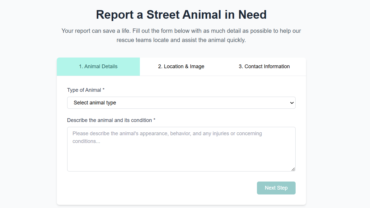 - 📍 Users can report a street animal with location, photo, and condition details.