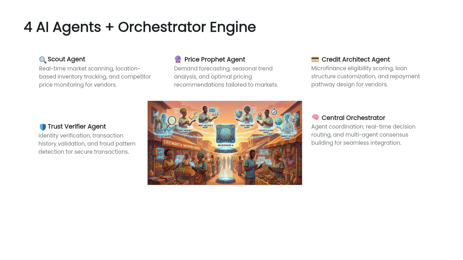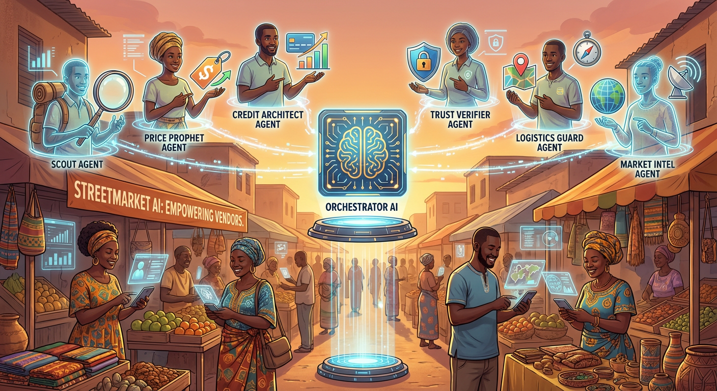 STREETMARKET AI is a multi-agent system built on Elastic Agent Builder that empowers 200 million informal street vendors across Africa with AI-powered market intelligence, transforming the invisible into the invaluable.
