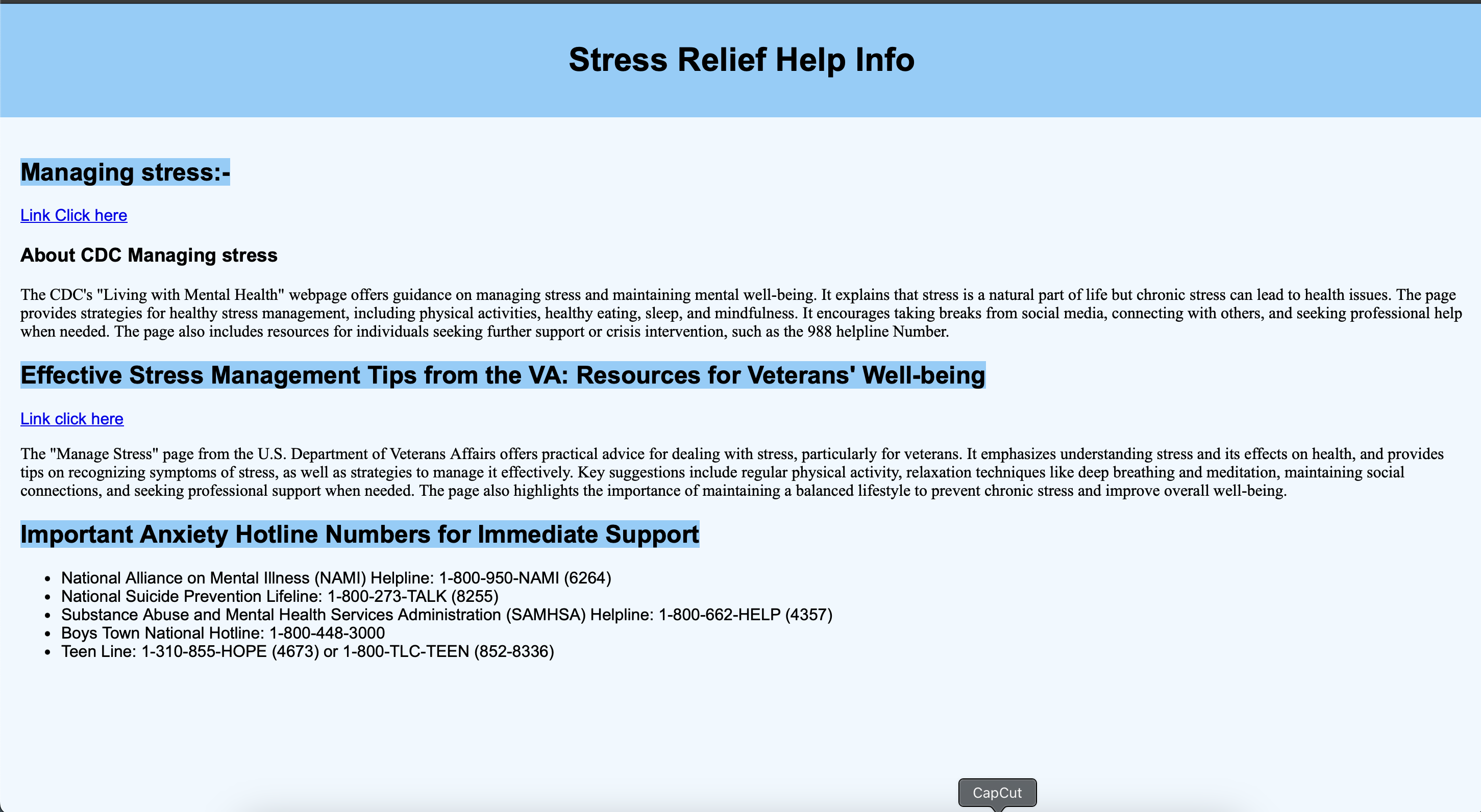 🛠 How I Built My Project: • HTML & CSS: Created the main layout with a soft, relaxing color scheme to reduce visual stress • Video Background: Added a looped nature-themed background video to create a soothing ambiance • Audio Player: Integrated a relaxation music file with a Play/Pause button using JavaScript • Live Digital Clock: Used JavaScript’s setInterval() to display real-time, adding a calming digital clock • Resource Page: Created a linked detailed help page (More-detail.html) with: • Helpful articles from CDC and VA • Hotline numbers for immediate support • Footer Navigation: Added a link for users needing professional mental health resources