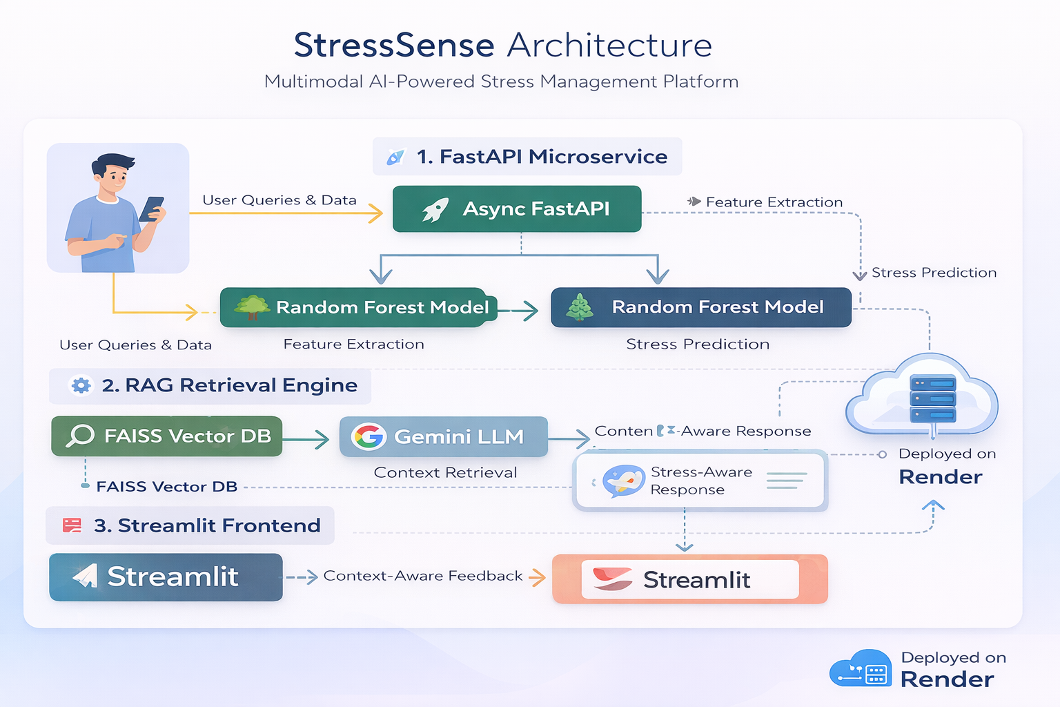 2️⃣ RAG Architecture Embedded curated mental health knowledge sources. Stored vector embeddings using FAISS. Used Gemini LLM for response generation. Combined: Retrieved medical context User stress classification Personalized prompts Final response =LLM(User Context+Retrieved Knowledge)