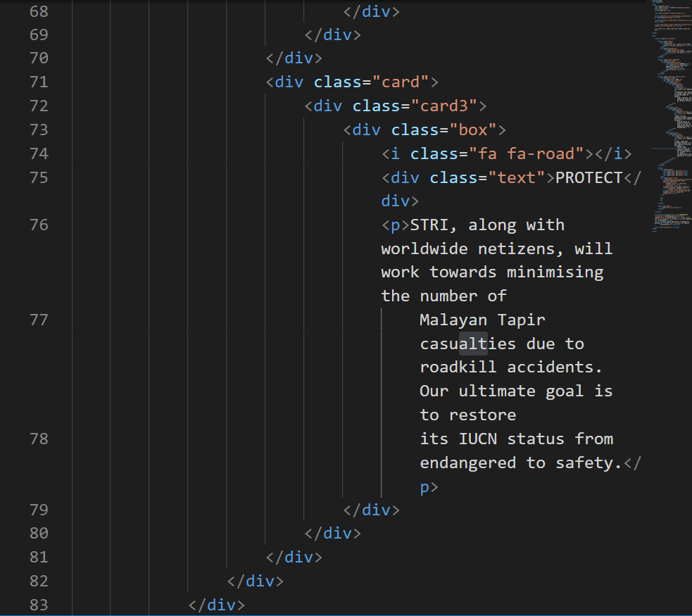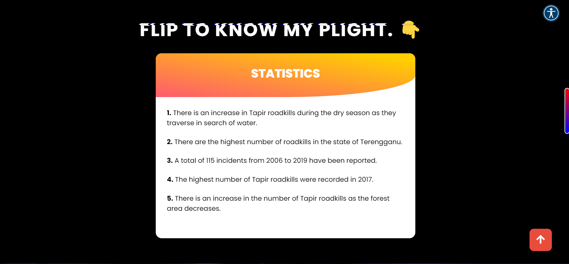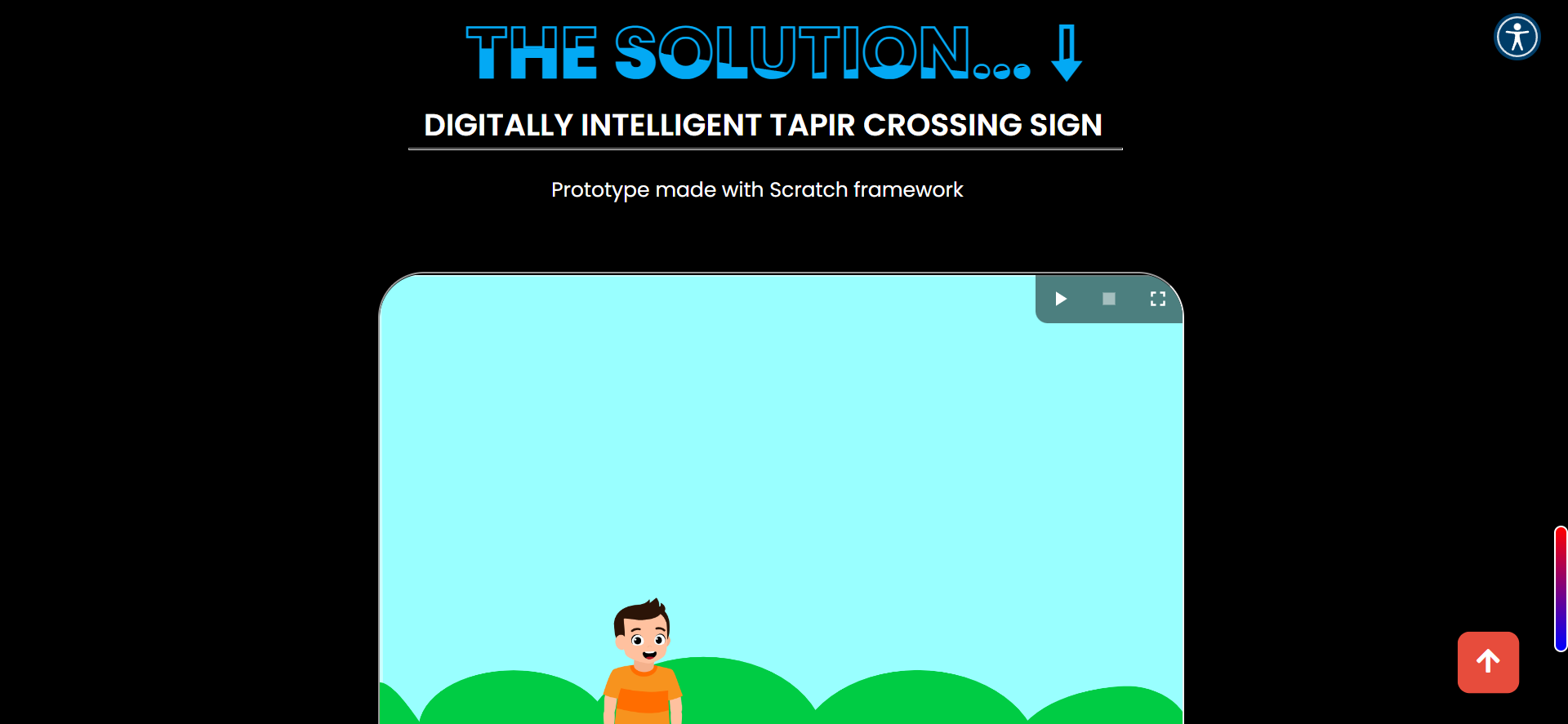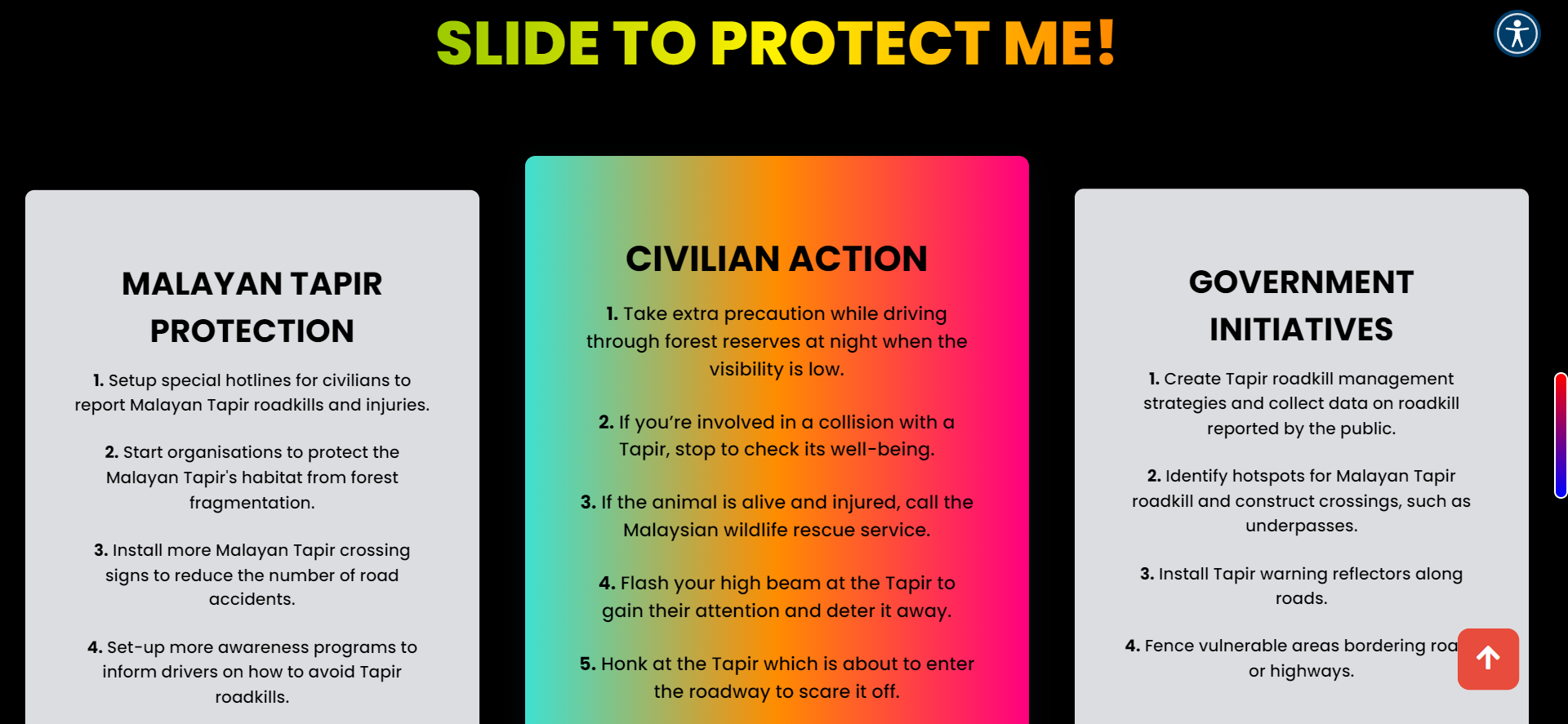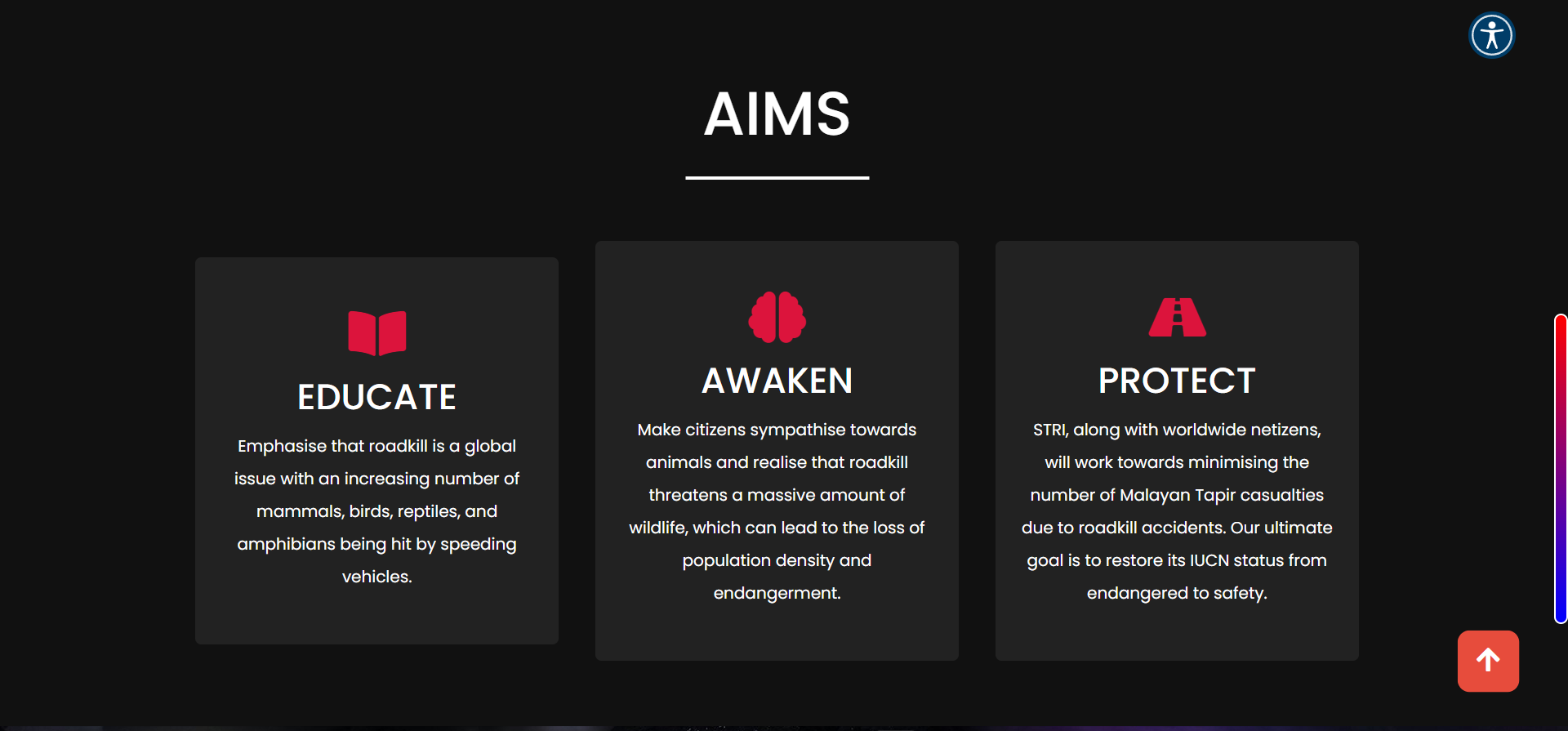 STRI gives a brief introduction of the Malayan Tapir, and provides concise information (Reason for their roadkill and consequences) and statistics describing its roadkill incidents. Suggestions have been proposed to the government and civilians. A unique prototype (Artificially intelligent Tapir crossing sign) designed by Team SRP, using Teachable Machine and the Scratch Framework, has also been embedded in the website to better educate the audience. My website is also accessible to the visually challenged due to the addition of an API named UserWay. It encompasses many features, such as screen reader, contrast changer, and a dyslexia font switcher. The website is responsive, making it viewable on a variety of devices, each having their own different dimensions.