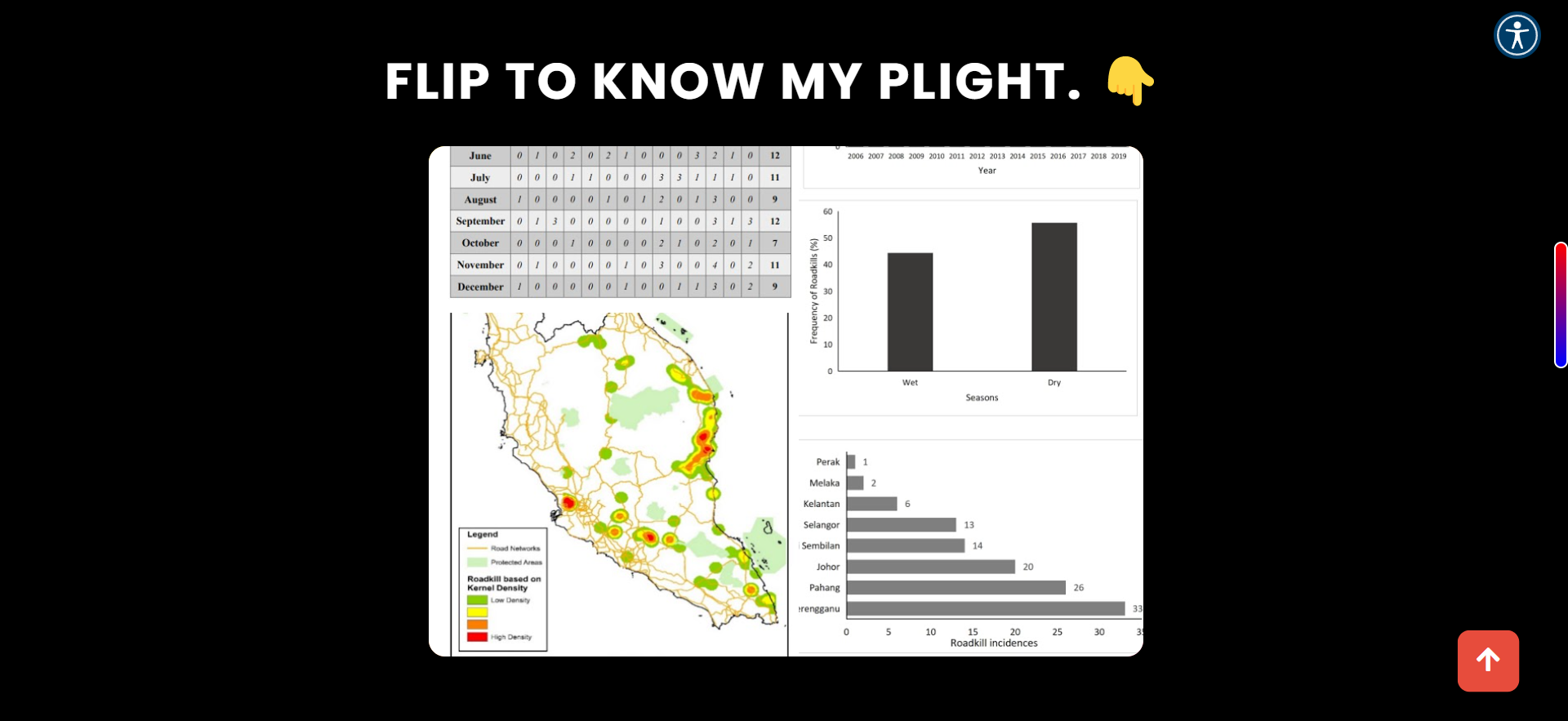 I will be implementing the misery of other animal roadkill worldwide, in addition to the Malayan Tapir. A backend will also be incorporated, making the website more dynamic and enabling the presence of user-interactive sections. I will also work towards making my unique prototype, a digitally intelligent crossing sign, a reality, and raise more awareness to the commuters.