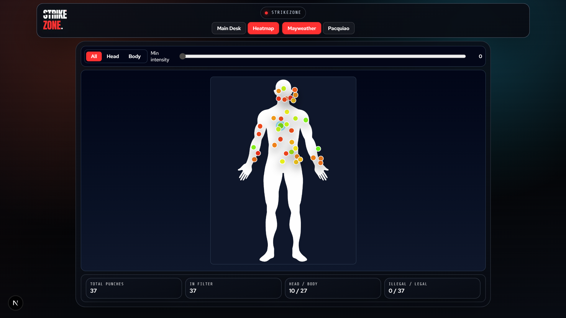 StrikeZone detects fighters, tracks punch impacts and classifies strike zones, allowing us to produce engaging graphics like strike heatmaps and live punch tracking alongside a video.
