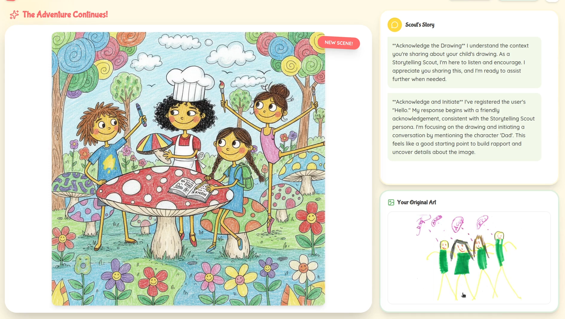 - Multimodal Live Adventure: A voice-enabled "Storytelling Scout" engages the child in a real-time conversation. The Scout asks about the characters' names, ages, and roles, reacting dynamically to the child's voice and the drawing itself.