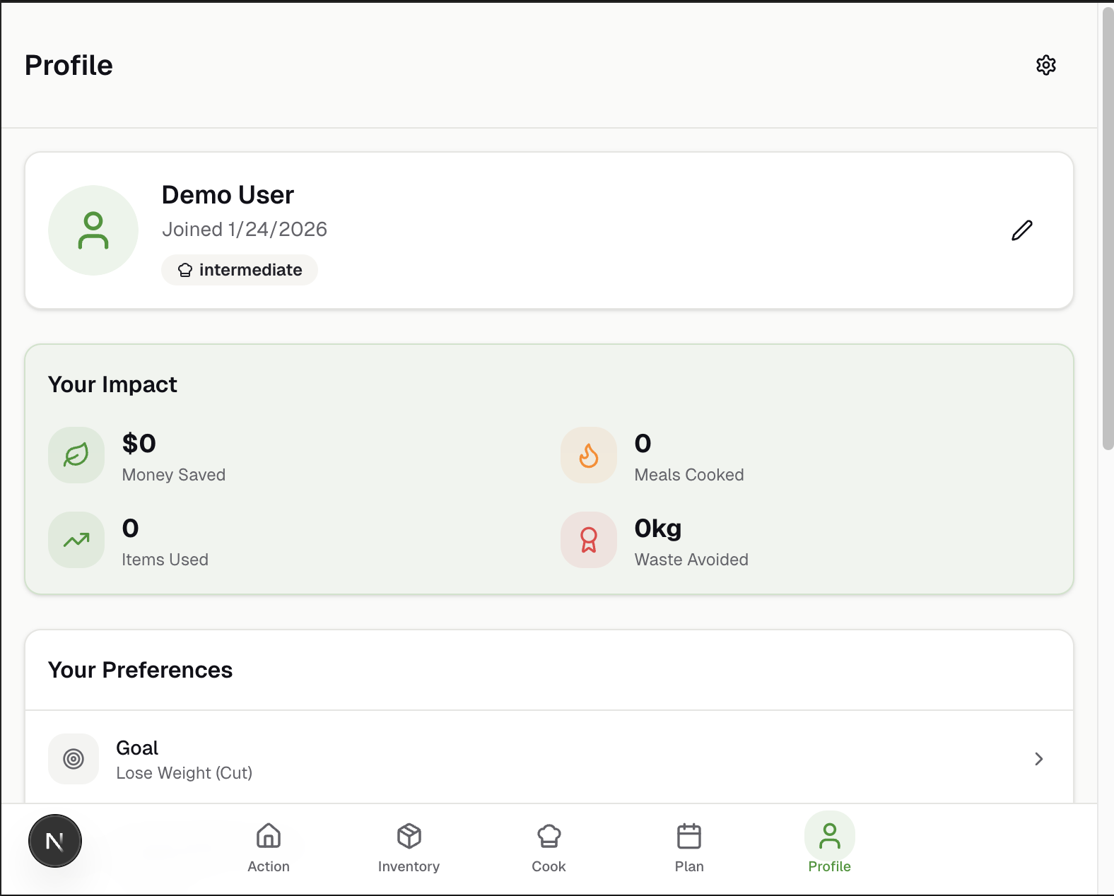 We built a mobile app with a clean UI and a backend centered on real user state: onboarding preferences (goals, restrictions, skill, time), a live pantry inventory with expiration dates, and cooking sessions. The core engine takes your inventory and constraints (meal type, time, difficulty, nutrition focus) and scores recipes by usefulness, heavily prioritizing ingredients that are closest to expiring, then filtering by dietary needs and matching your goals. Recommendations are generated with structured, explainable outputs so the app can show why a meal was chosen and exactly which pantry items it uses. On the experience side, we implemented a guided cooking mode that turns recipes into step-by-step instructions with built in timers for each step, plus voice-powered inventory entry to make adding food fast and natural.