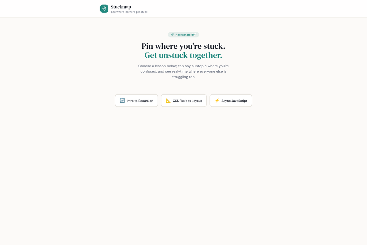 Stuckmap is a real-time confusion heatmap for any lesson. Students anonymously pin subtopics where they're confused (😕 a bit confused → 🤯 totally lost), and blocks light up from cool blue to critical red based on aggregate confusion. Peers can write short "think of it like…" explanations and upvote the most helpful ones. Instructors get a live analytics dashboard showing friction rankings, confusion breakdowns, and coverage gaps — all updating in real time.