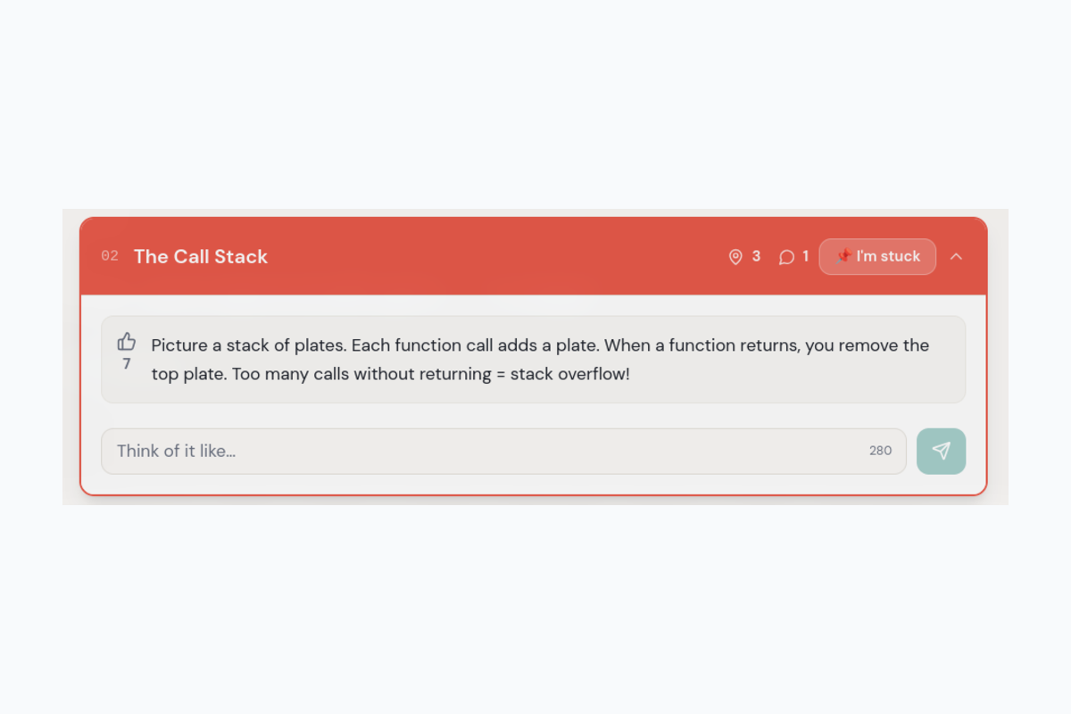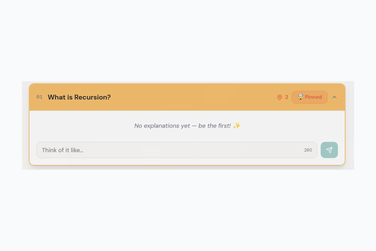 Every classroom has a silent majority — students too shy to raise their hand or ask "can you explain that again?" We wanted to build a tool that makes confusion visible, turning it from a hidden problem into actionable data. Inspired by heatmaps and anonymous polling, we imagined: what if learners could "pin" where they're stuck, and peers could crowdsource explanations in real time?