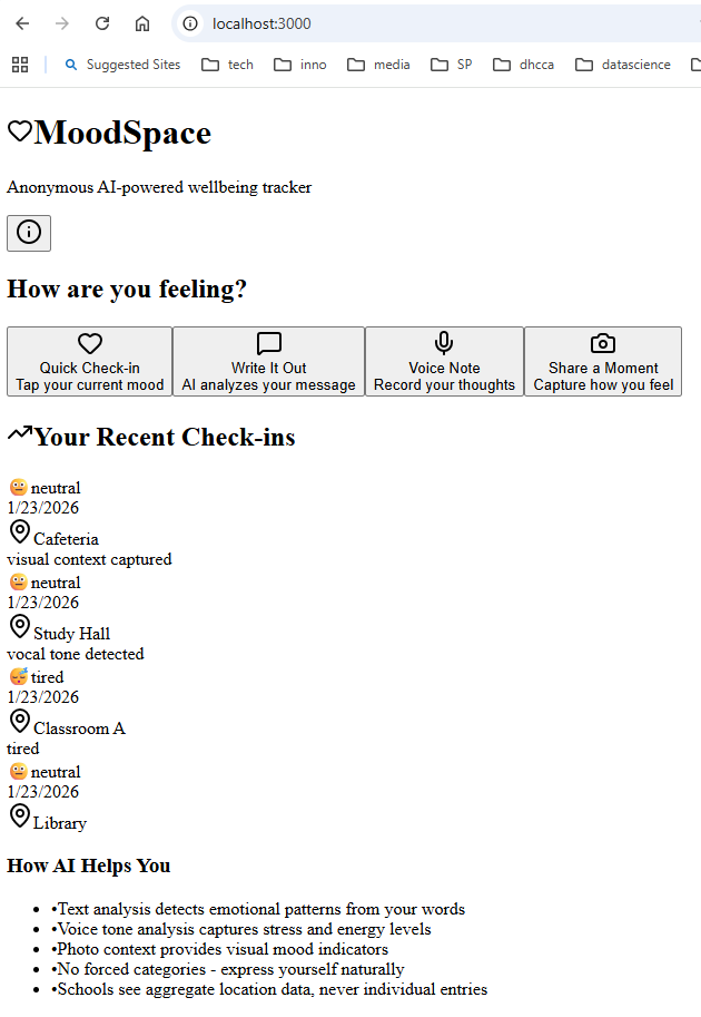 A free, privacy-first web app that helps students track their wellbeing using AI. Students can express their mood through text, voice, photos, or quick emoji selection. Schools get anonymous location-based insights to better support student mental health.