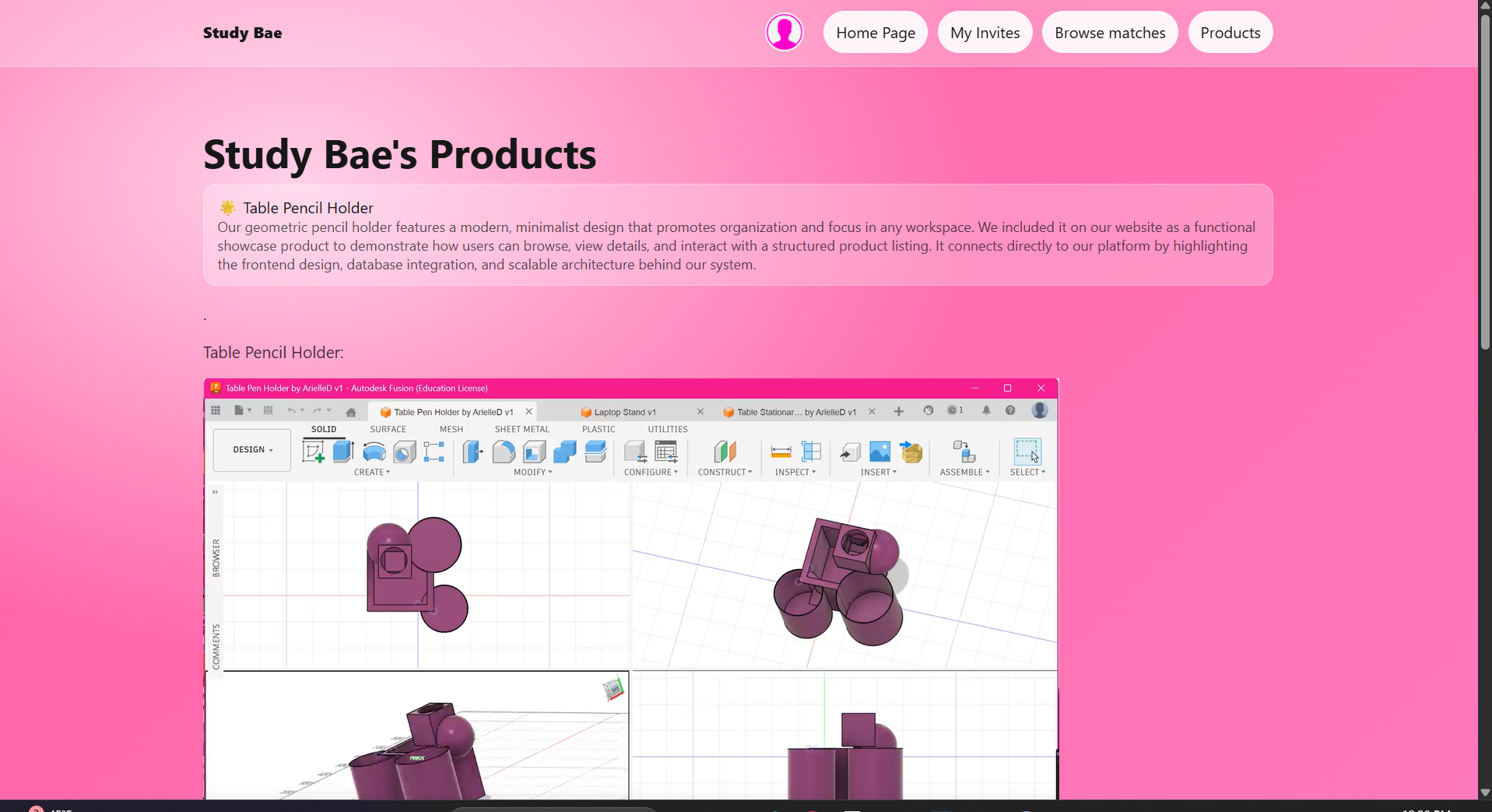 - We used HTML, CSS and JavaScript to produce our website. First, one of our group members created our website layout, two of us went in and used code to edit the buttons for the website and the profile page to make them functionable, and our last group member created a 3D modeling product on Fusion360.
