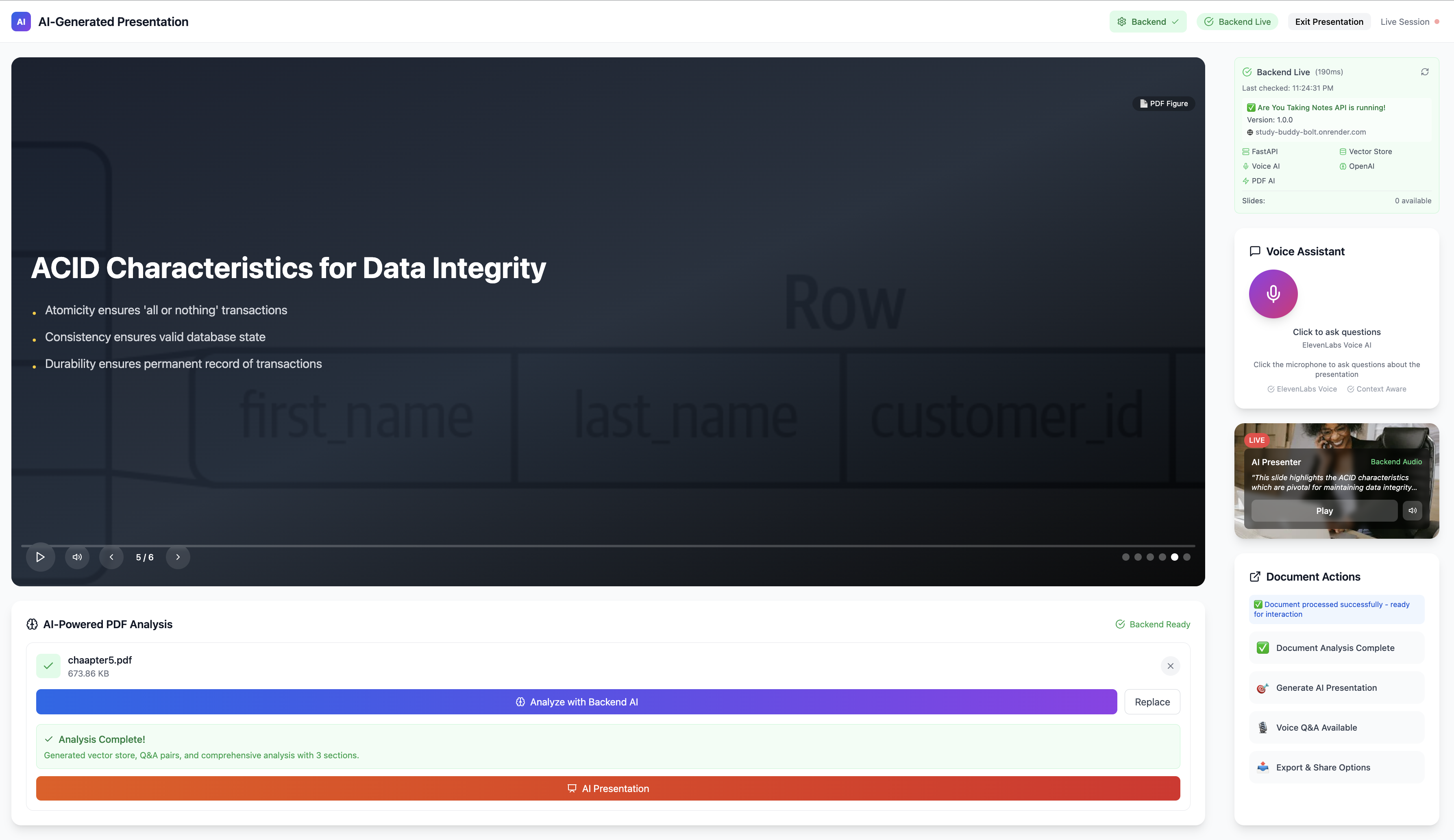 My core achievement is Study Buddy, an application that converts academic PDFs into interactive, AI-narrated presentations with integrated Q&A.