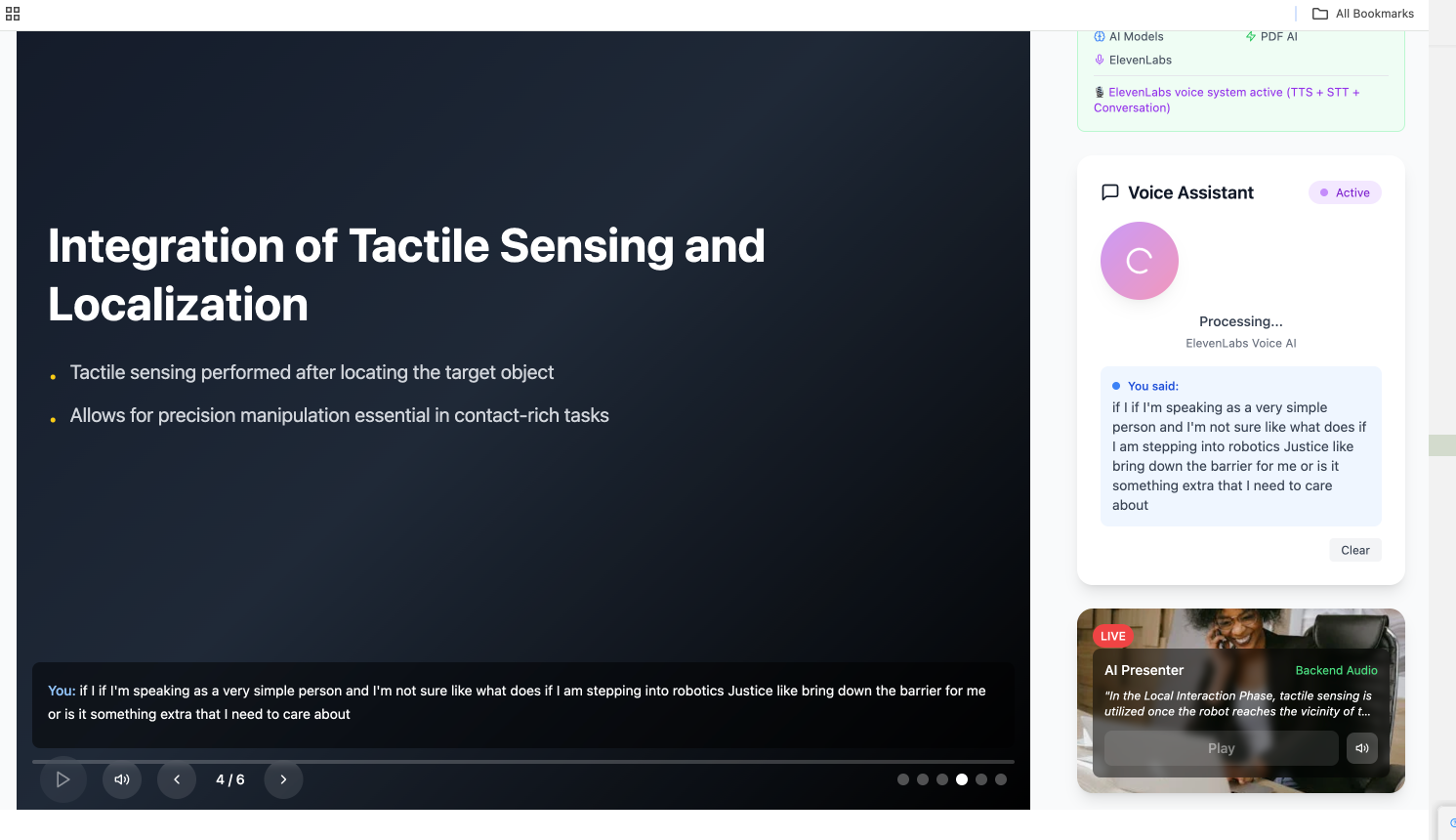 Strategic Backend for AI Orchestration: I encountered a significant challenge when trying to monitor and orchestrate complex, multi-agent AI workflows. Operations like processing 100MB+ PDFs, orchestrating sophisticated AI for deep research and content generation (for slides and voice via OpenAI's Response API), and generating audio files are computationally intensive and outside Bolt.new's immediate native scope. This necessitated a minimal Python backend, specifically designed for these demanding AI tasks and leveraging asynchronous processing for efficiency.