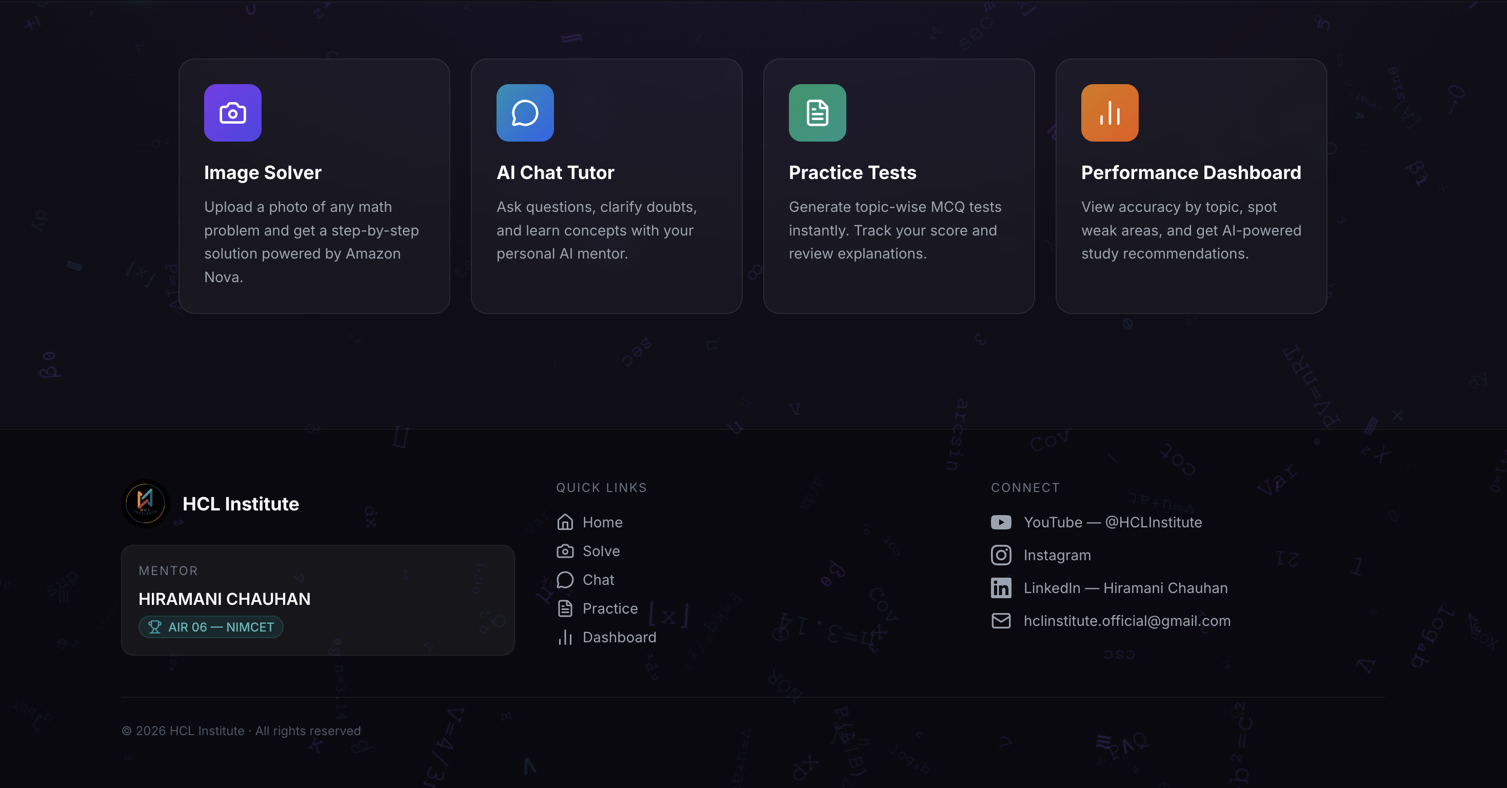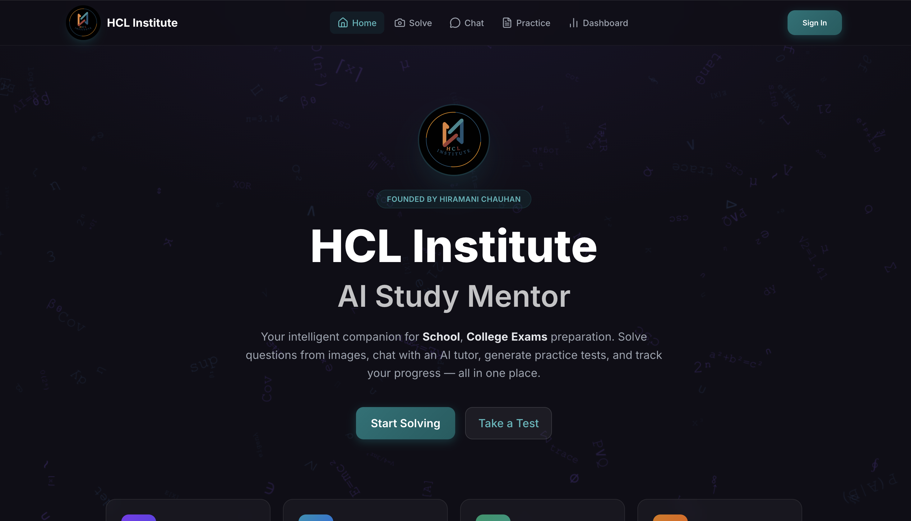 The HCL Institute AI Study Mentor is an all-in-one educational platform designed to support students while they study independently and bridge the gap between classroom learning and self-practice Image Question Solver: Students can snap a photo of any complex equation, such as _ ( \nabla \cdot \mathbf{E} = \frac{\rho}{\epsilon_0} ) _, and receive an instant, narrated step-by-step breakdown. Encouraging AI Tutor: A conversational mentor that uses simple analogies to explain difficult concepts in Math, Physics, and Informatics. Instant Practice Tests:Students can generate MCQ tests for specific topics instantly, allowing them to check their understanding right after studying. Detailed Analytics:The platform tracks student performance over time and highlights weaker areas, helping learners focus on the topics that need more attention.
