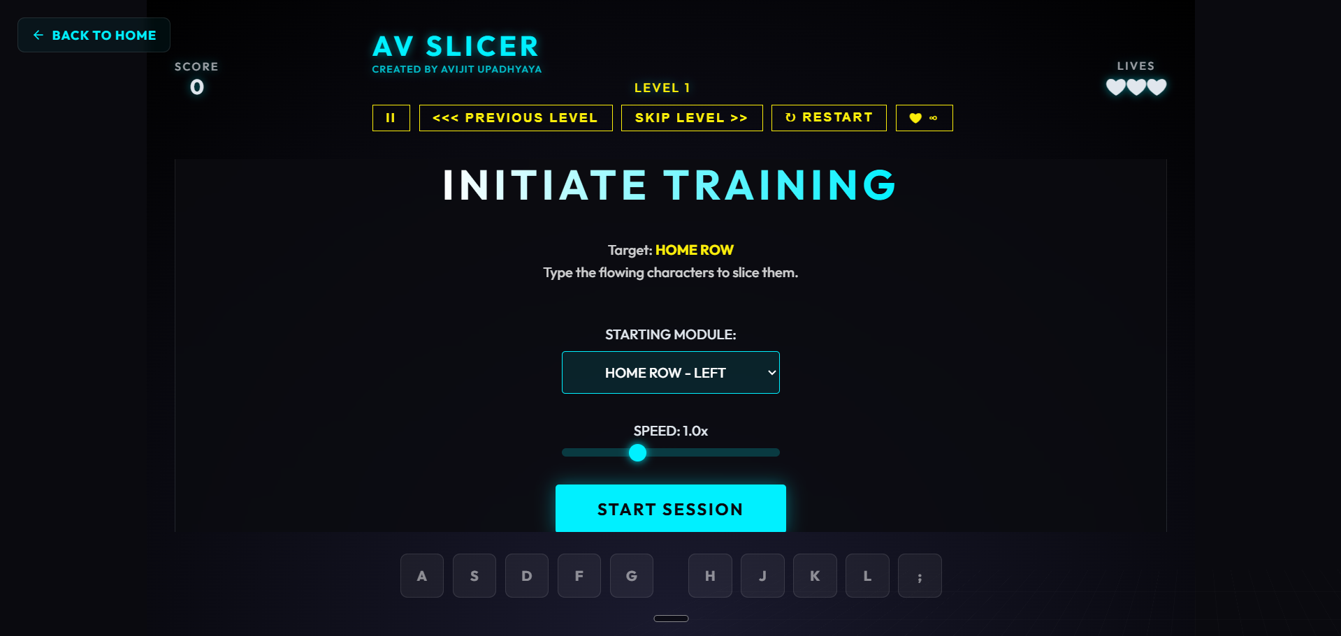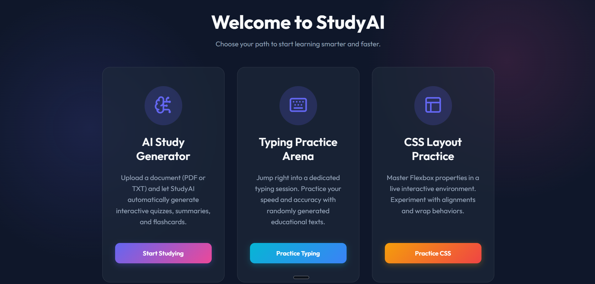 Home Page (index.html) Entry portal with sleek navigation for the AI Study Generator, Typing Practice Arena, and CSS Layout Lab.