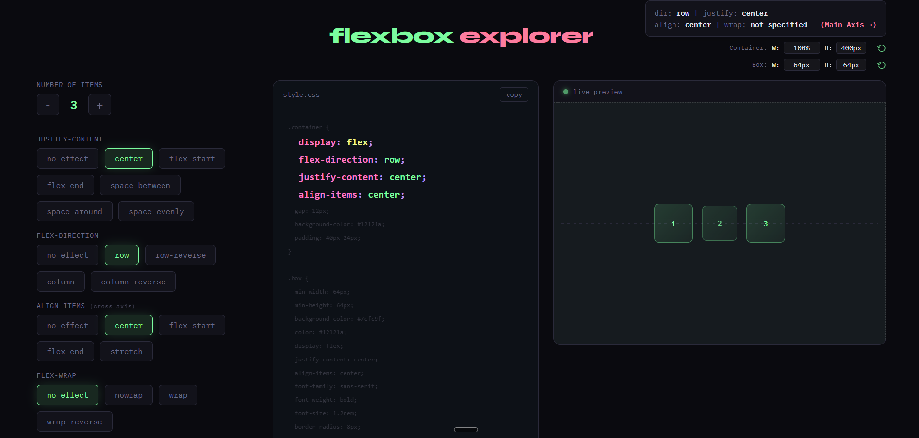 CSS Practice: Sandbox for mastering Flexbox. Features live controls for direction and alignment with real-time visual previews.