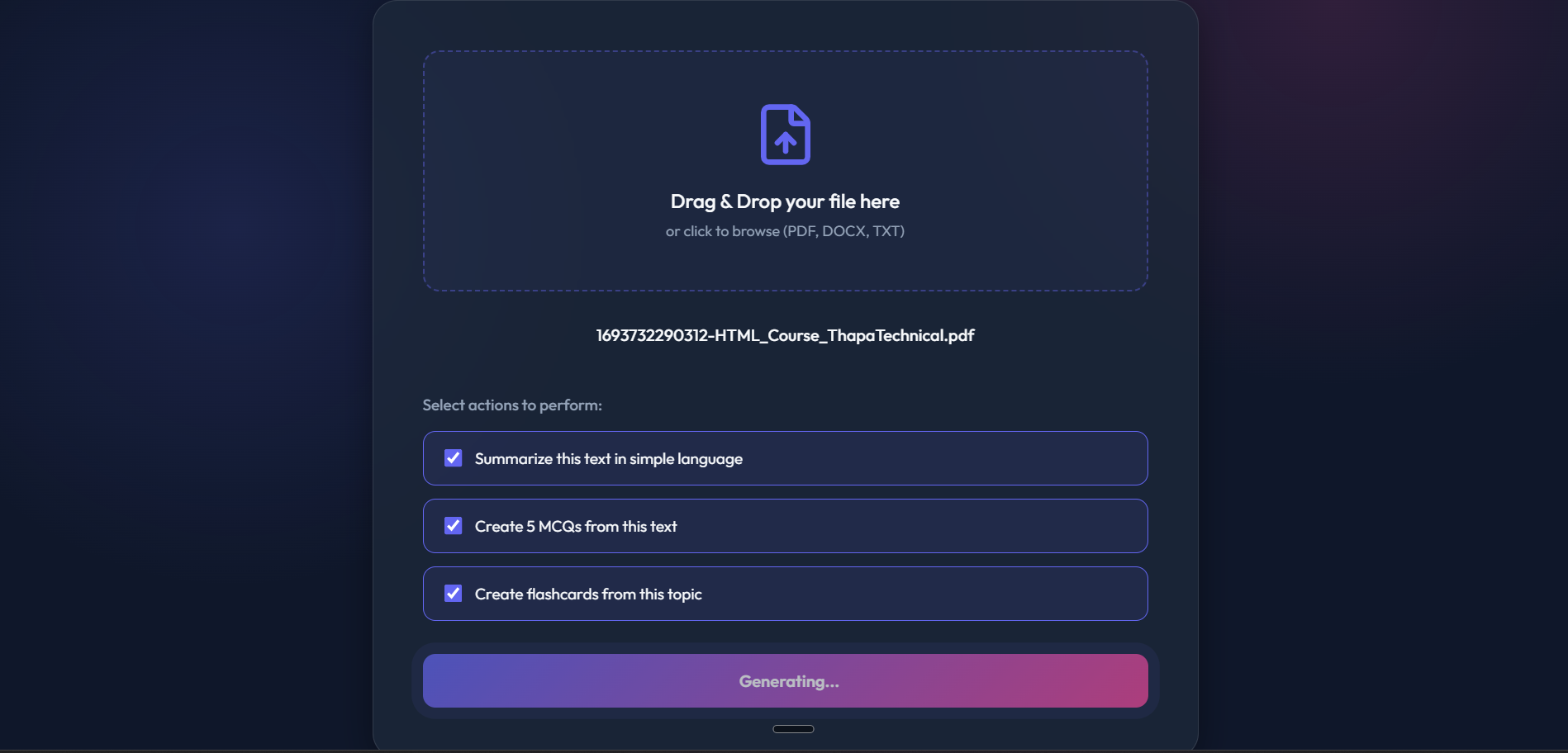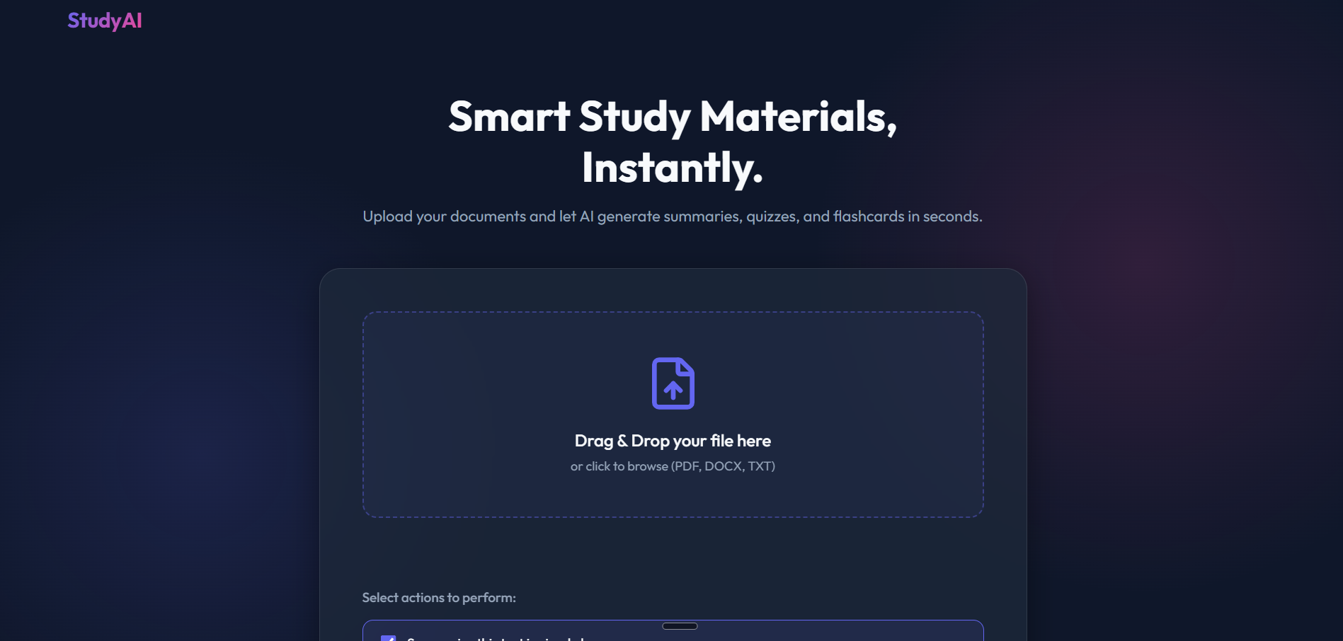 StudyAI is a smart learning portal that acts as an autonomous educator. Users upload a PDF or TXT file and are instantly redirected to a personalized dashboard featuring: