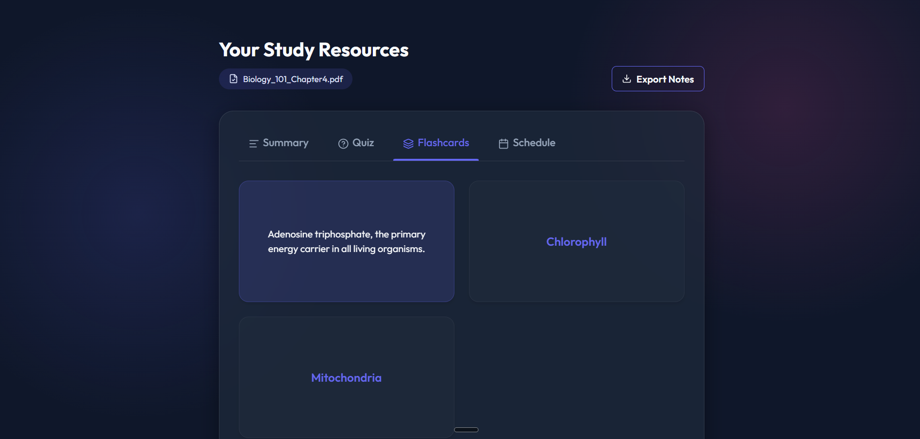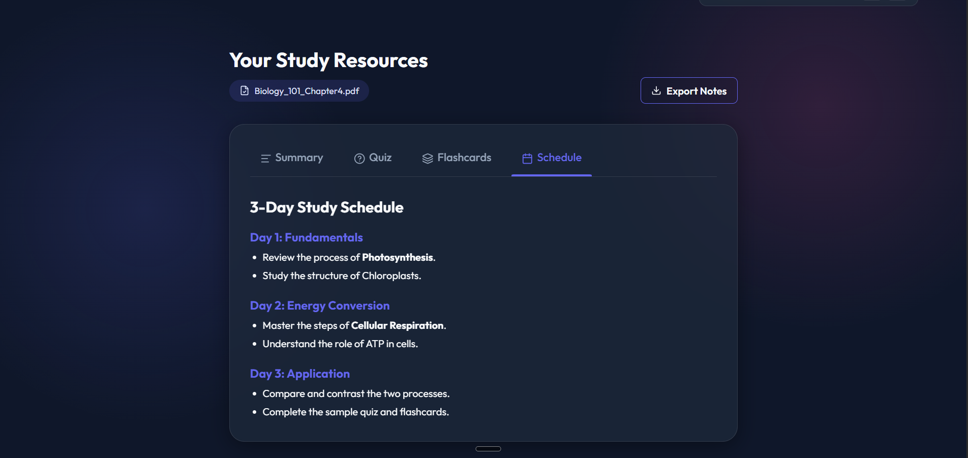 Schedule: Drafts a structured 3-Day Study Plan to break your material down into manageable daily goals.