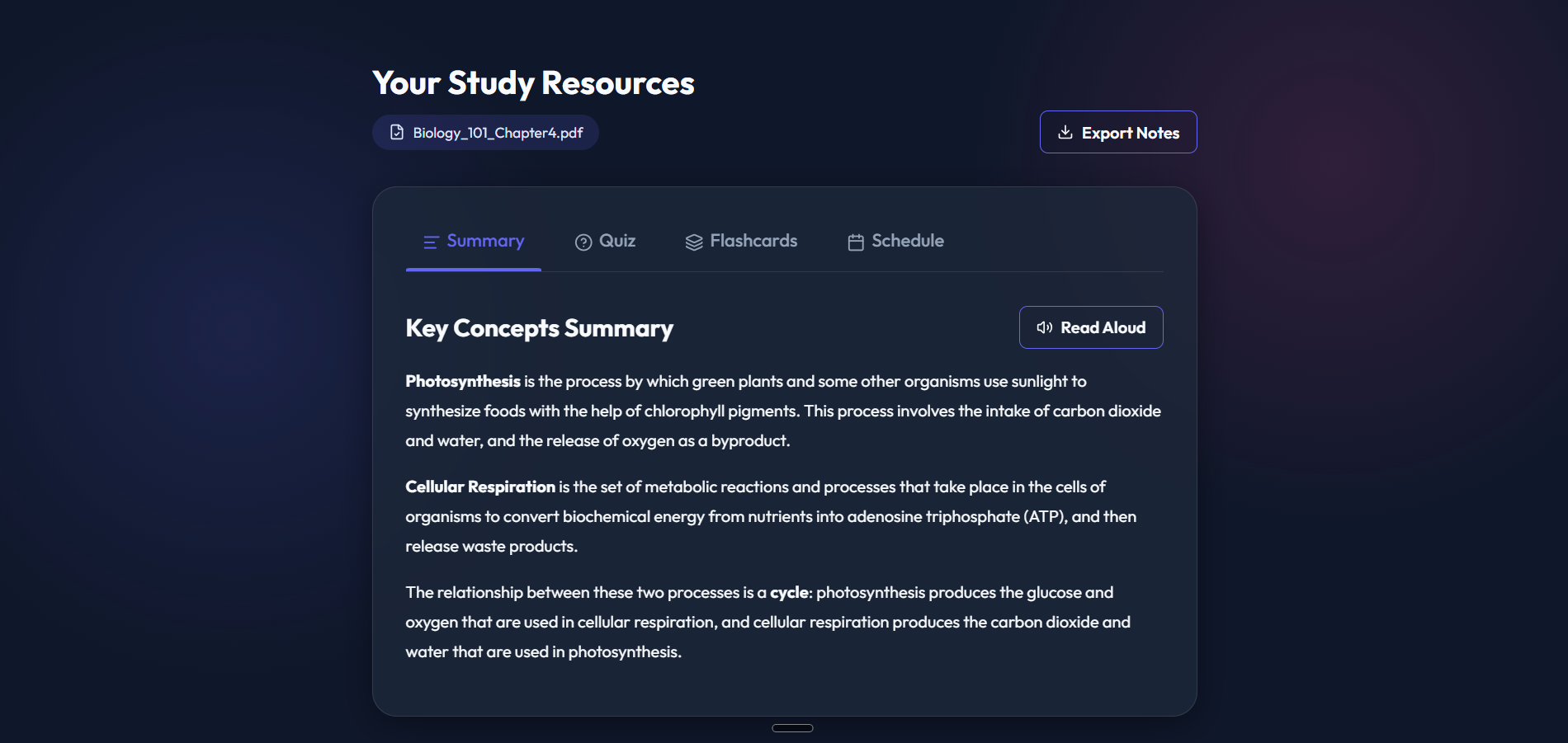 Read Aloud: Uses an AI voice to read the summary aloud, which is perfect for auditory learners.