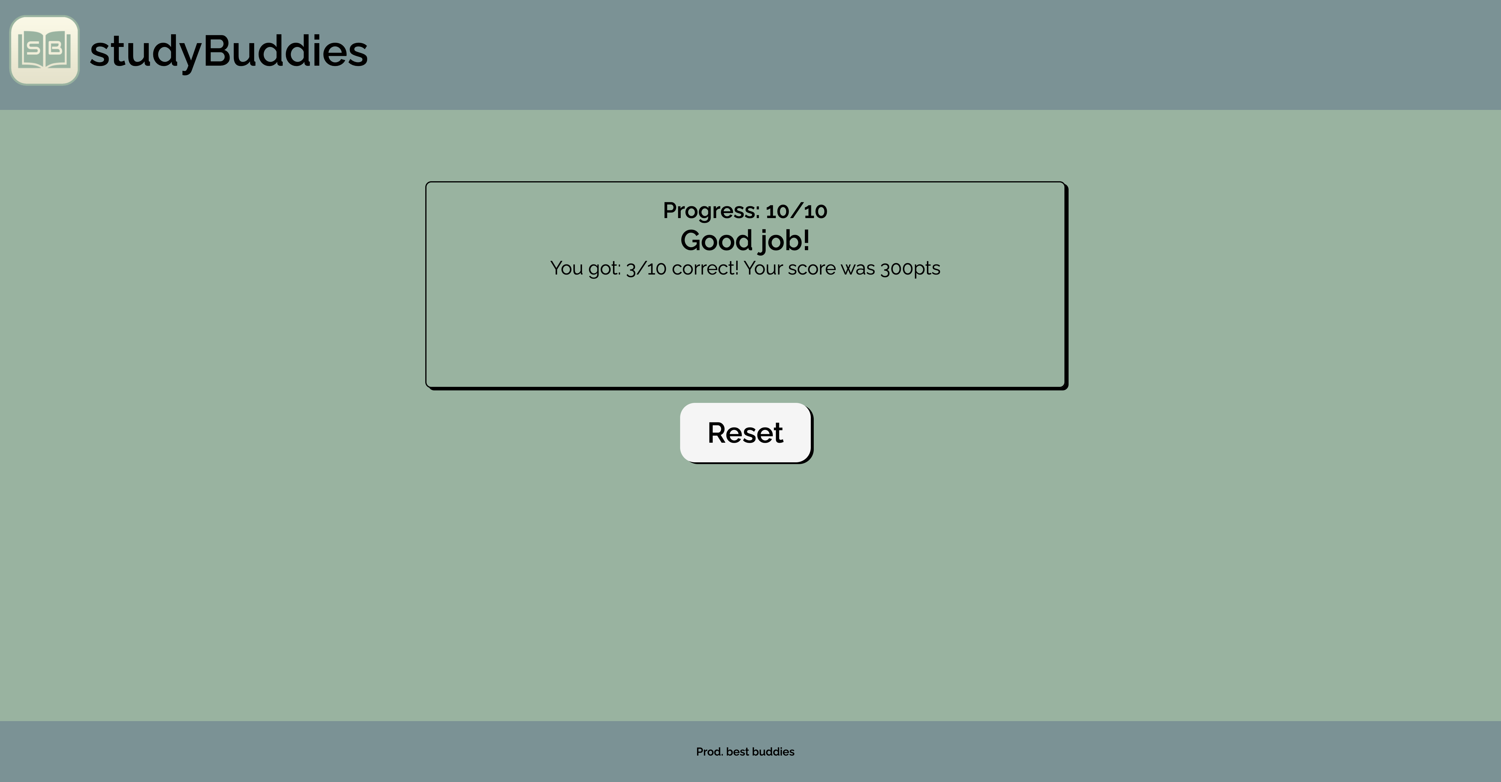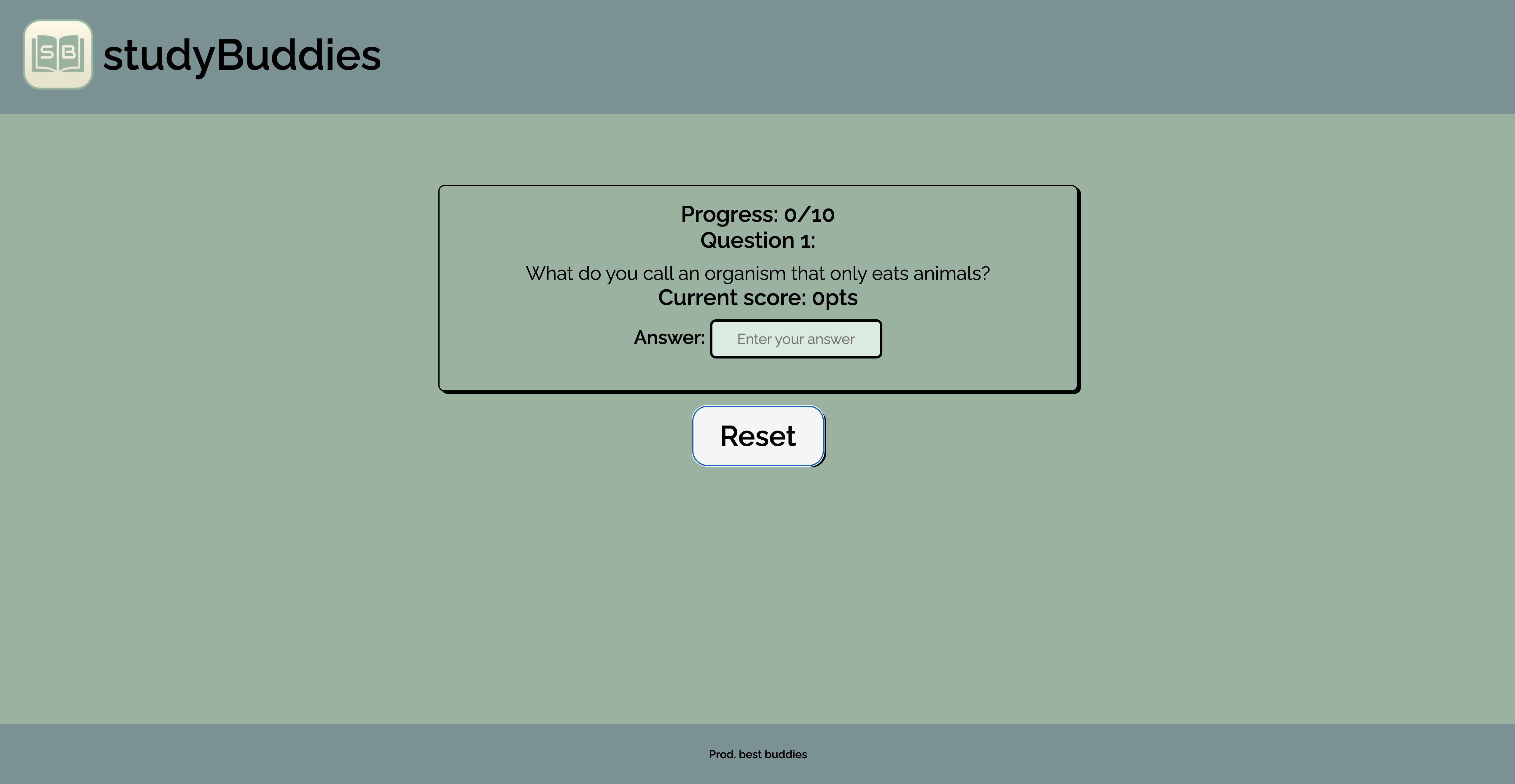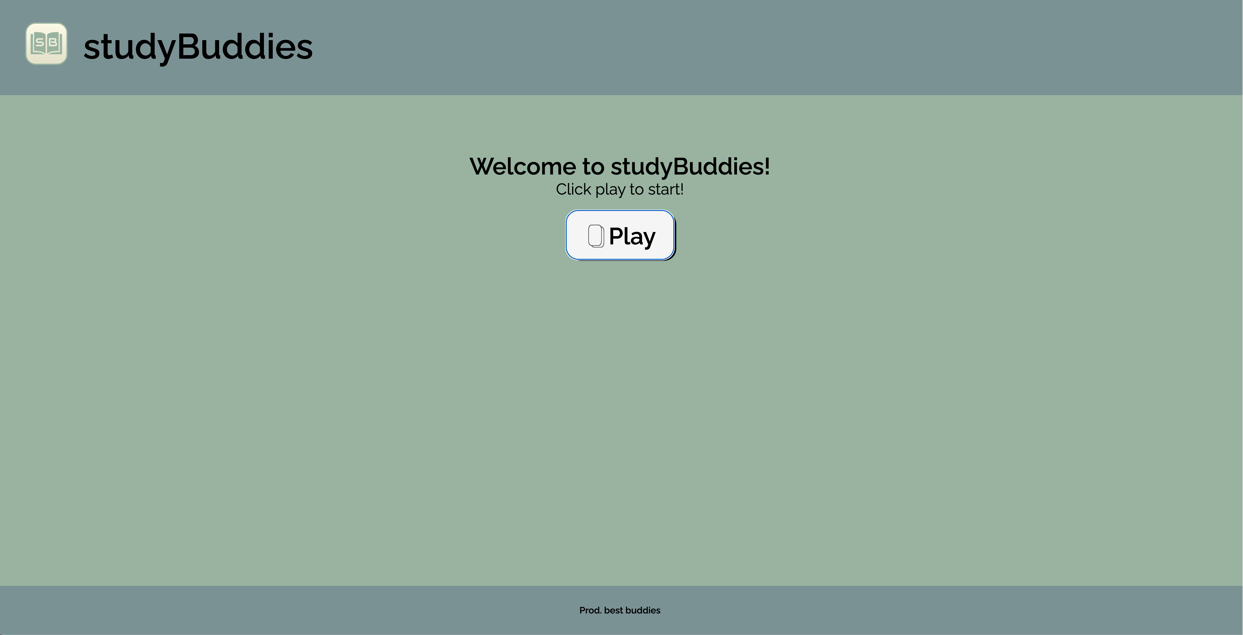 Our app, studyBuddies is a web app that is designed to resolve the lack of motivation of students by allowing them to create custom flashcards catered to the topic they are studying. Once you press "play", you will enter our gamemode that displays the questions on-screen with a textbox to input your answer.