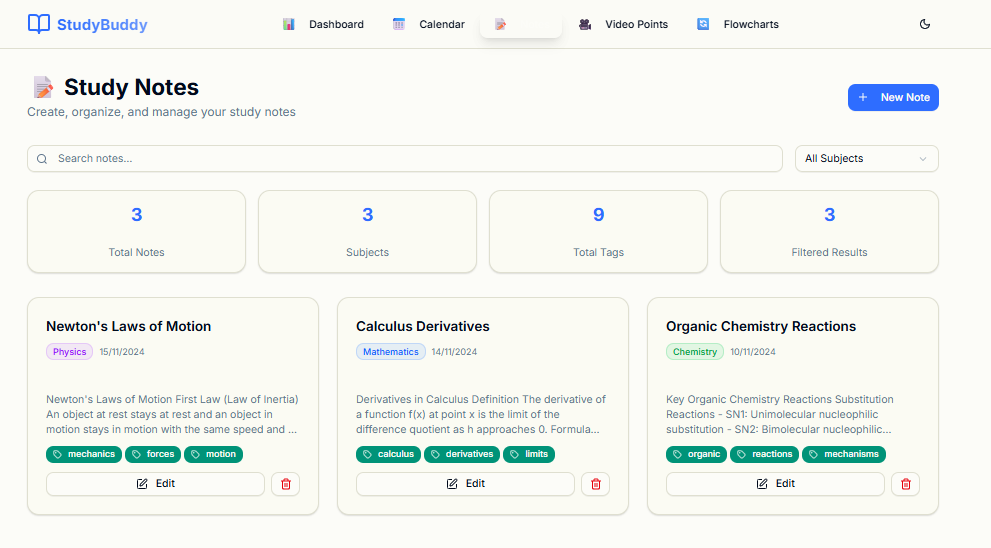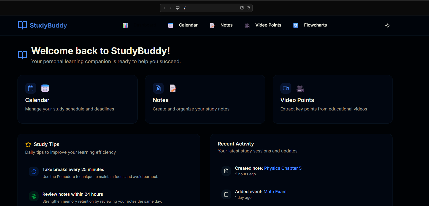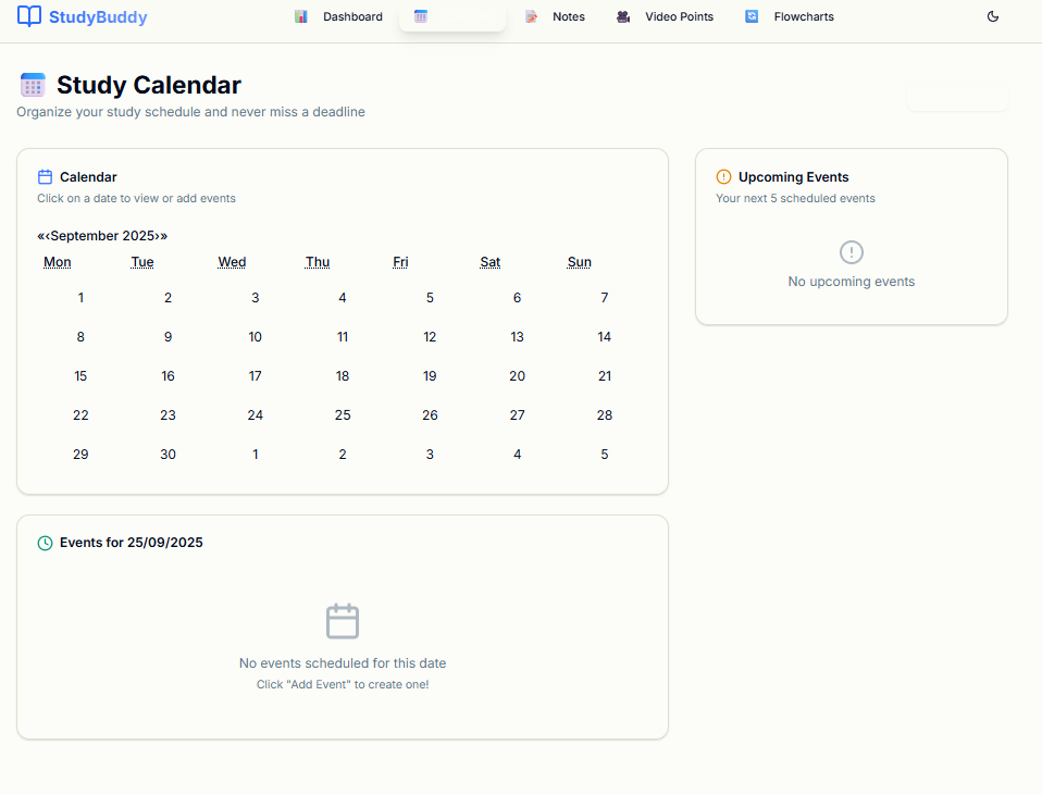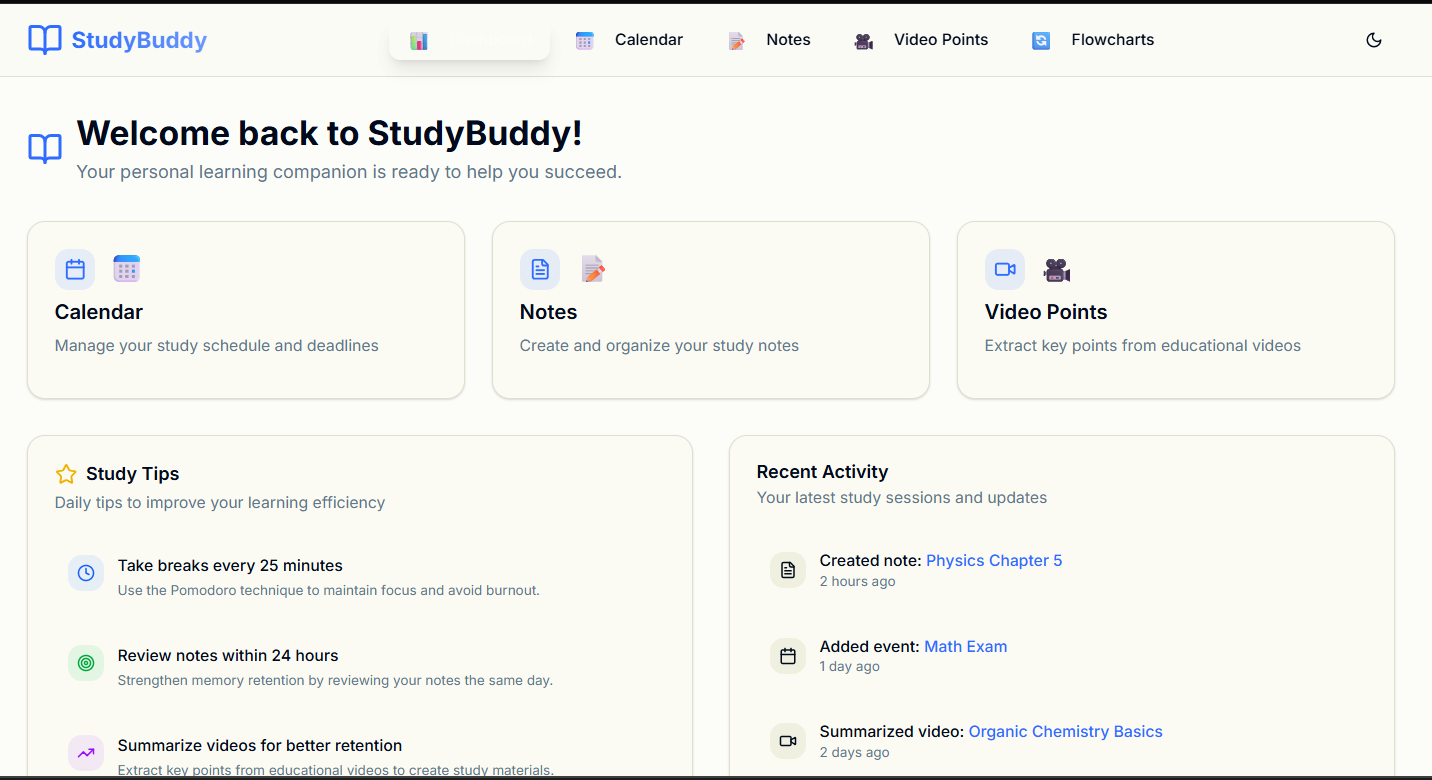 What it does StudyBuddy is a student-focused learning web app that helps users: 📅 Schedule tasks and track deadlines with an interactive calendar 📝 Write and save notes in a rich text editor 🎥 Summarize videos into key points (AI-powered placeholder) 📊 Create flowcharts to visualize ideas and workflows 🤖 Chat with an AI assistant for guidance and questions about study materials