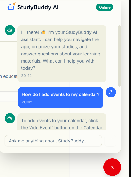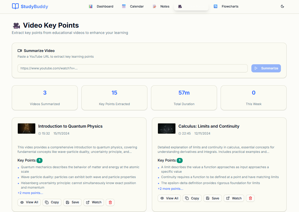 What's next for StudyBuddy Connect the AI assistant and video summarization to real AI APIs Add user accounts and cloud storage for notes, calendar events, and flowcharts Introduce community features, such as shared notes, discussion boards, and collaborative flowcharts Expand AI features: flashcards, adaptive quizzes, and personalized study recommendations