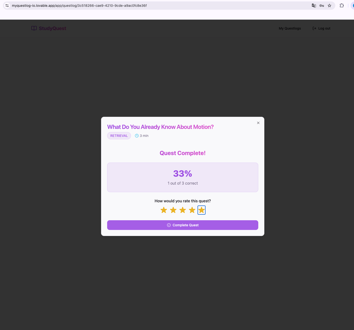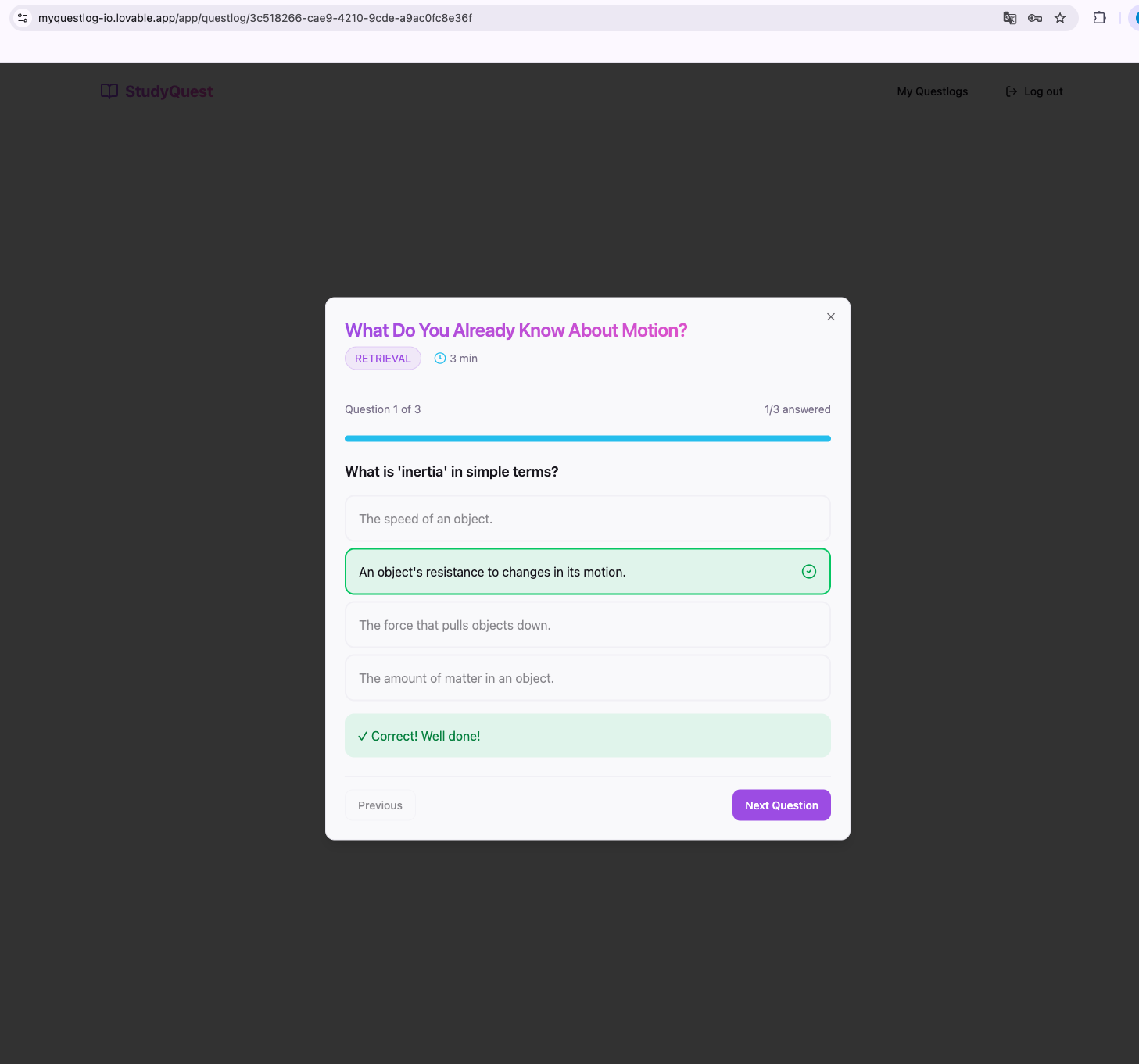 With StudyQuest, I wanted to combine those two worlds: solid learning science (active recall, spaced practice, scaffolding) wrapped in the motivational loop of a quest log. Instead of “I should study more”, you get “I’m on Quest 7 of my journey to master Linear Algebra” – a clear path, visible progress, and a reason to come back.