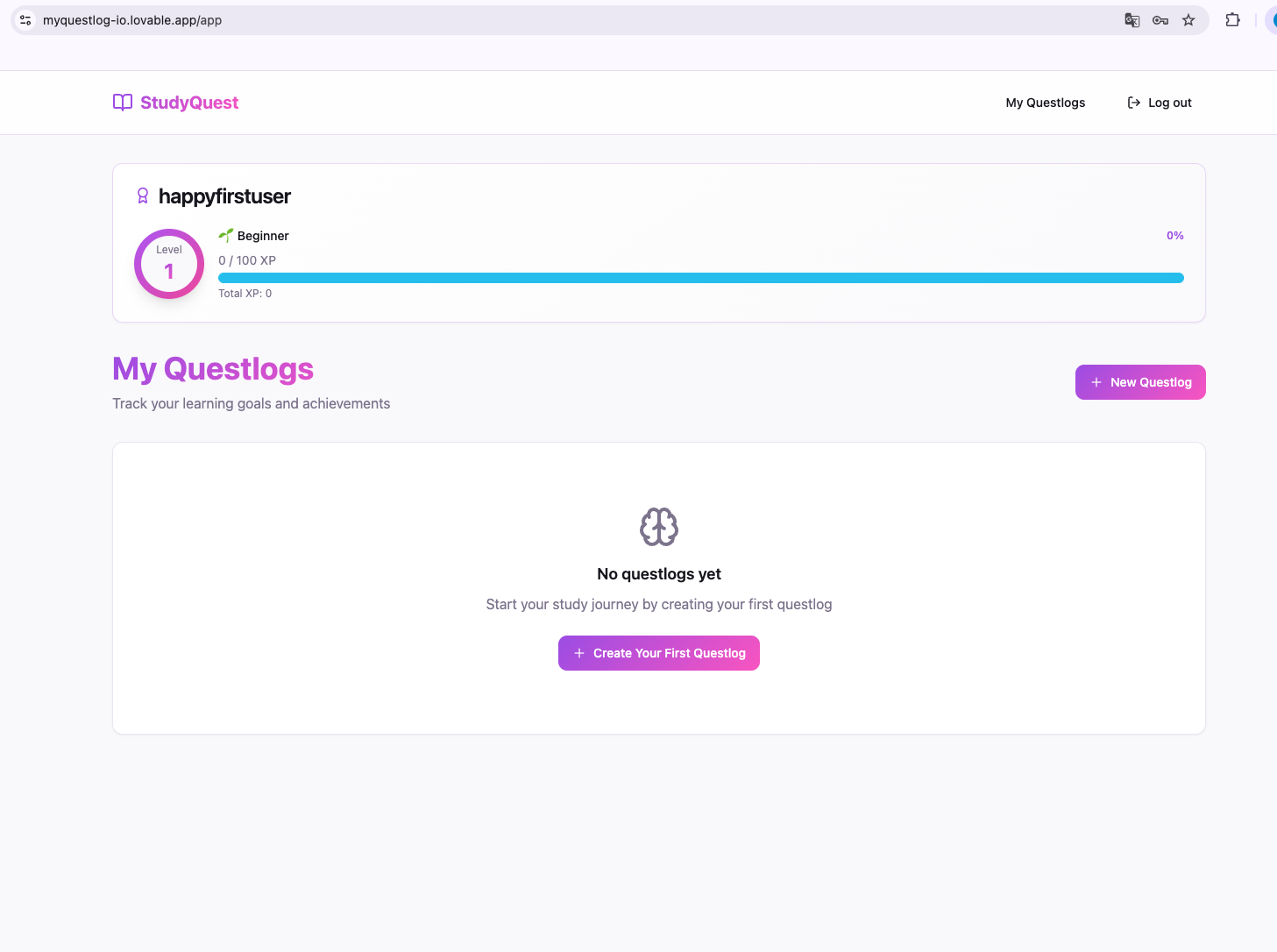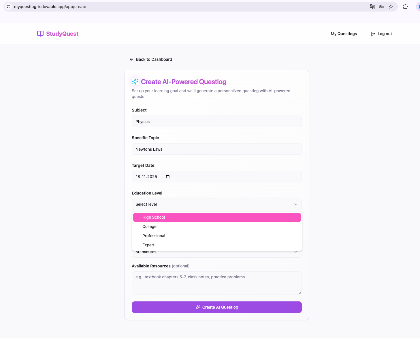 Create your first AI-powered questlog by setting subject, level, and target date.