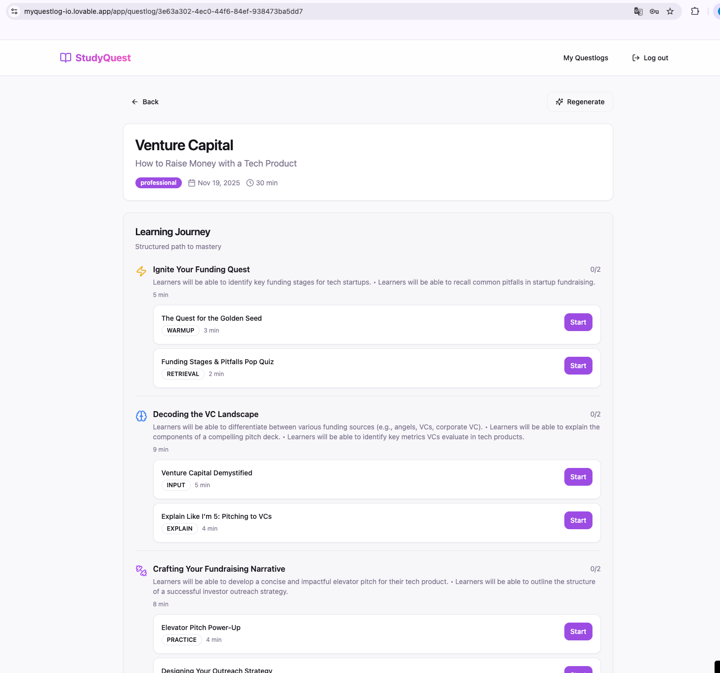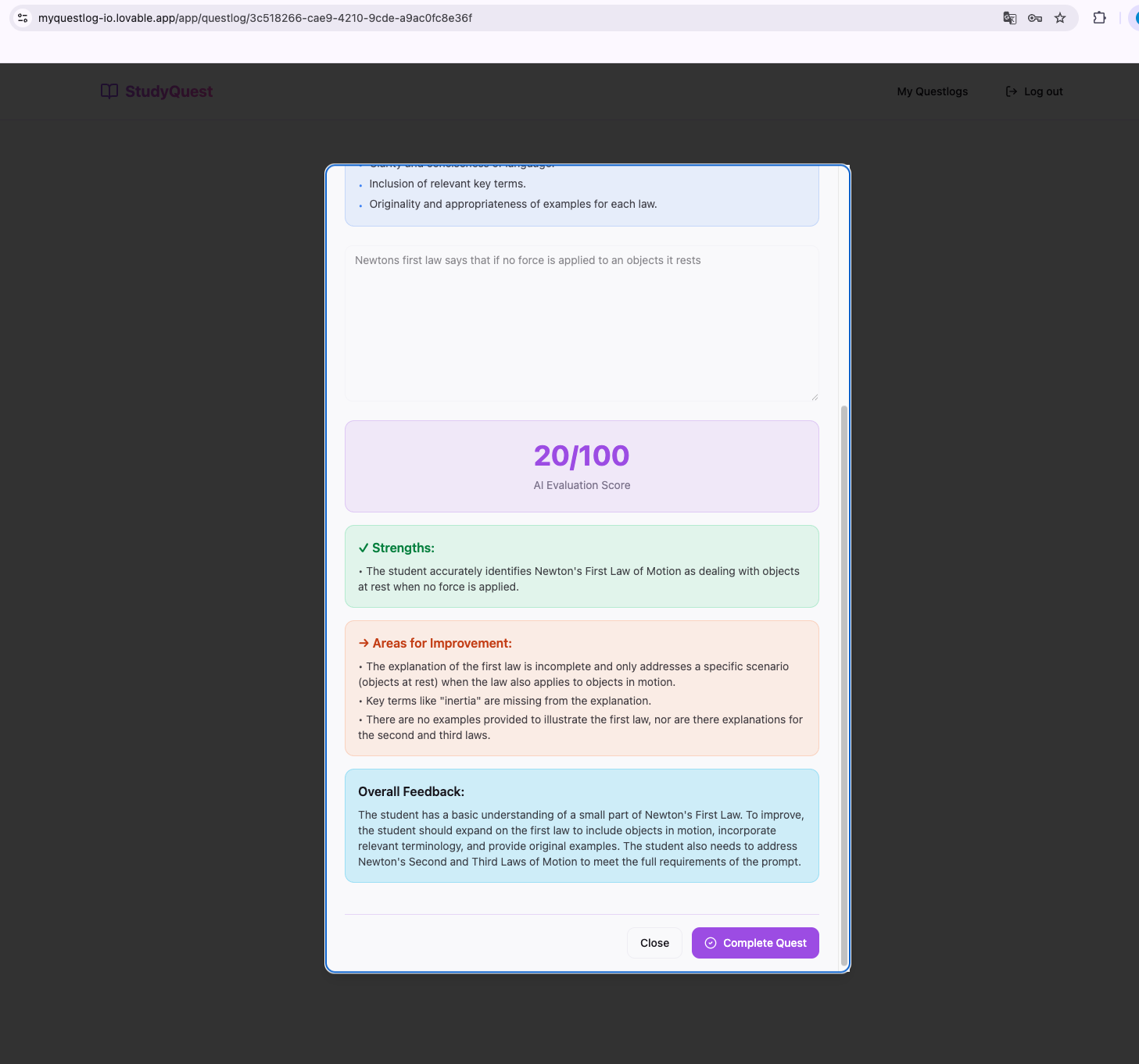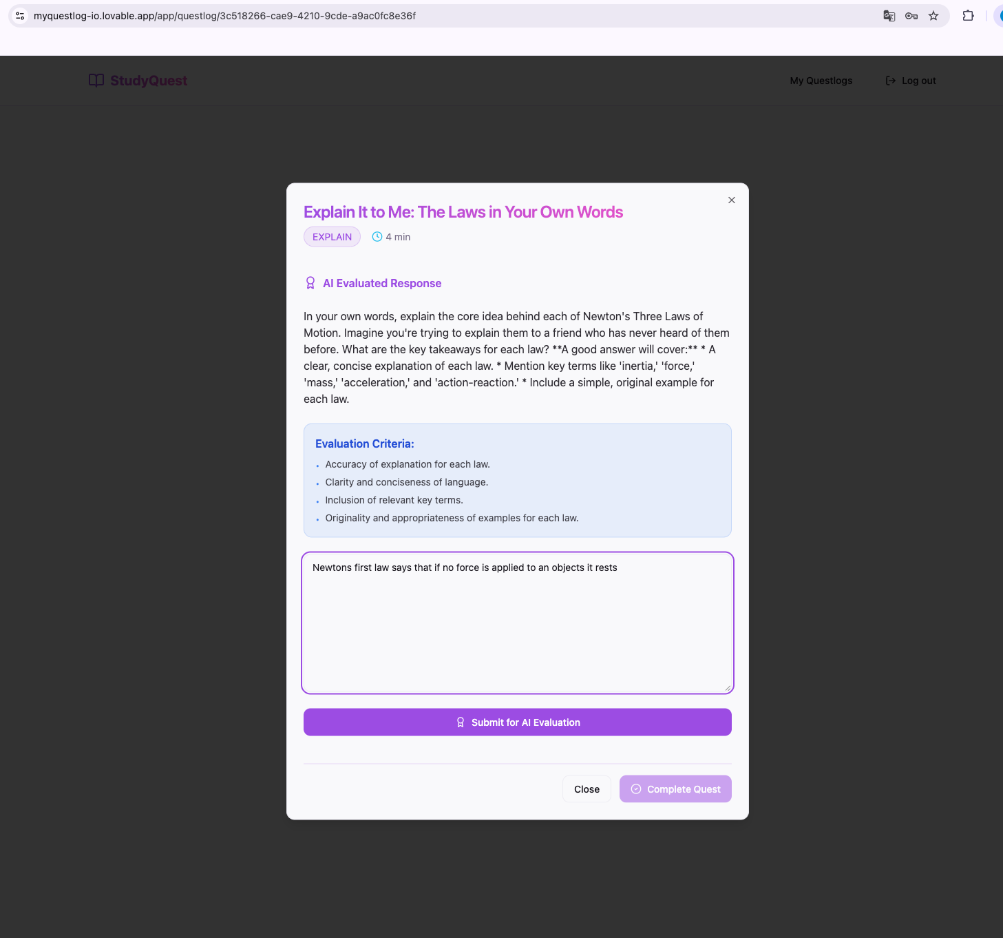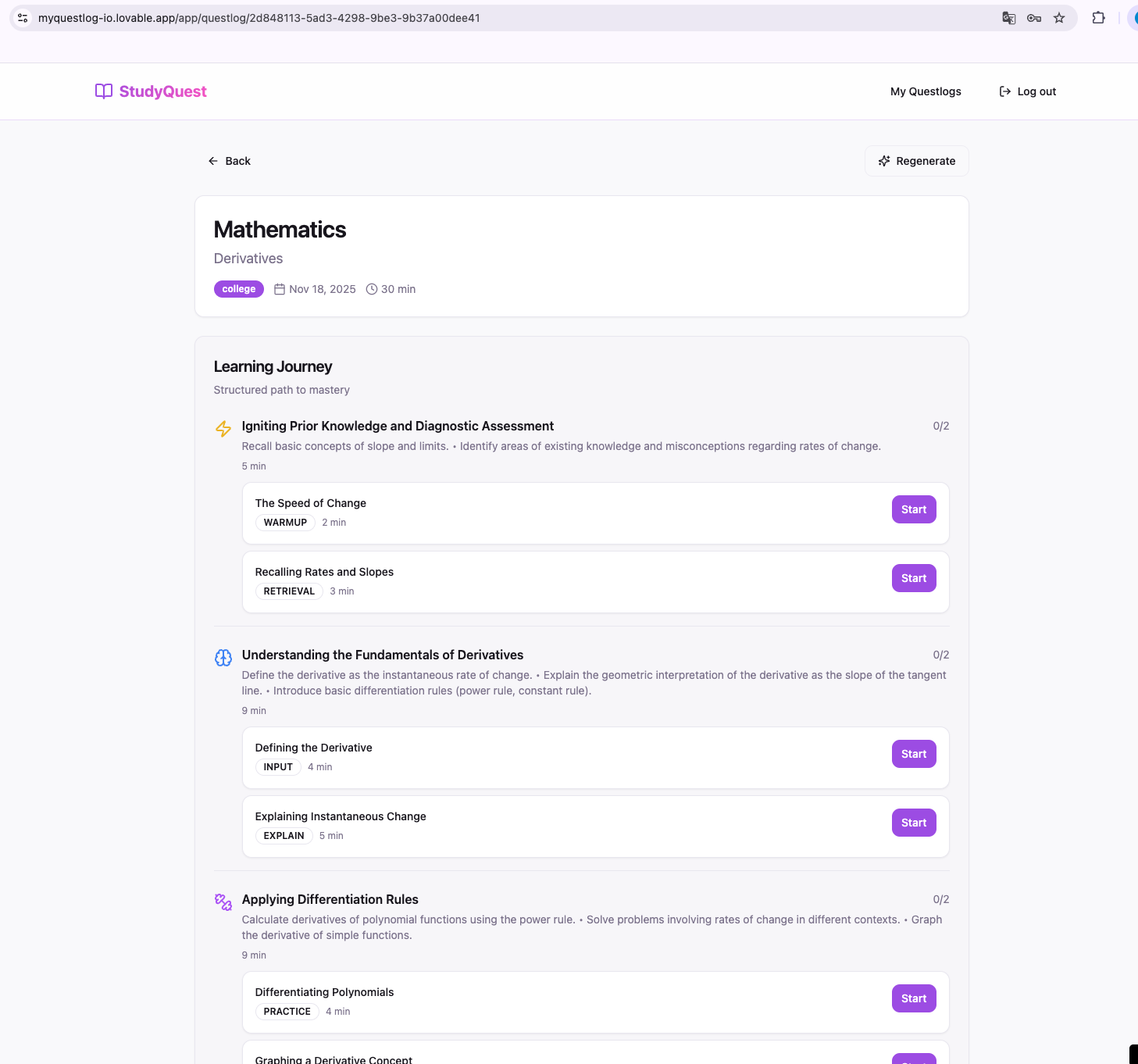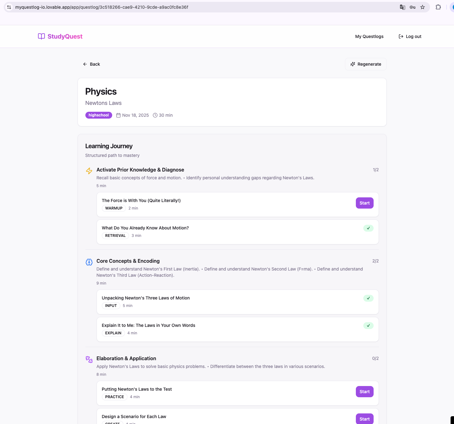 In short: you tell StudyQuest what you want to master, and it forges a complete learning adventure from zero knowledge to exam-ready.