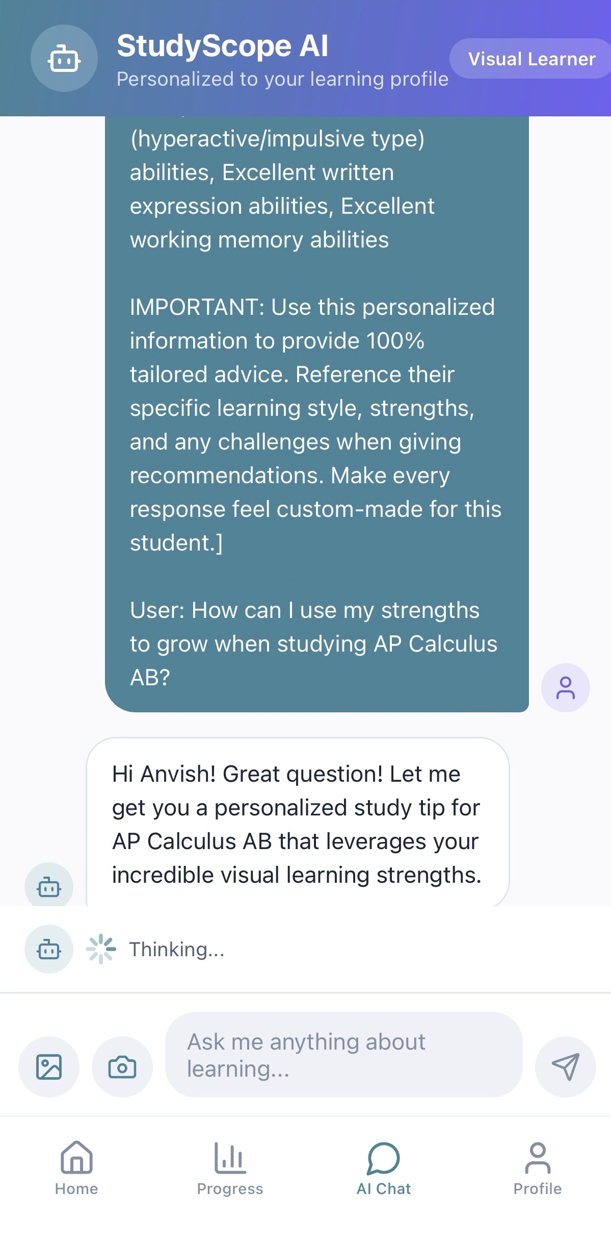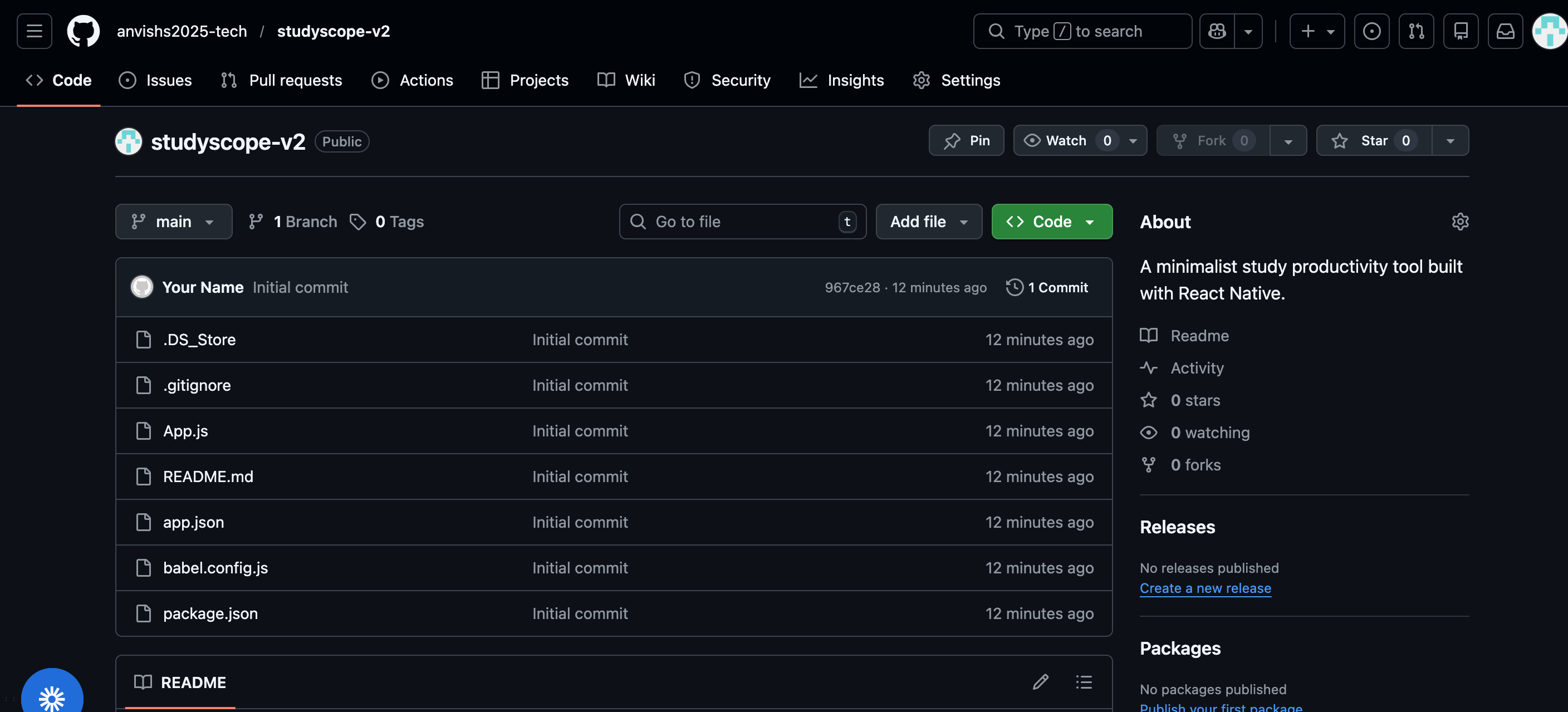 I built StudyScope using React Native and Expo to ensure a smooth, cross-platform experience. The UI was crafted using Flexbox and Native StyleSheets to maintain a minimalist look. I used Git for version control and hosted the source code on GitHub. The development process involved iterative prototyping to find the right balance between functionality and simplicity, focusing on core React hooks like useState to manage the app's internal logic. We locally ran the app on React's Expo Go app by downloading it on the IOS store and then offshoring it onto the app.