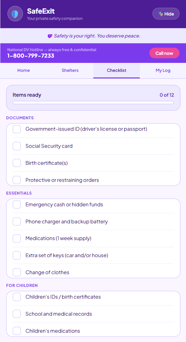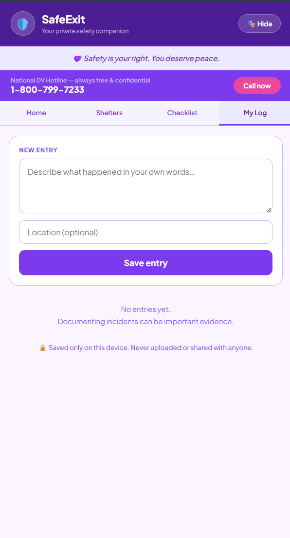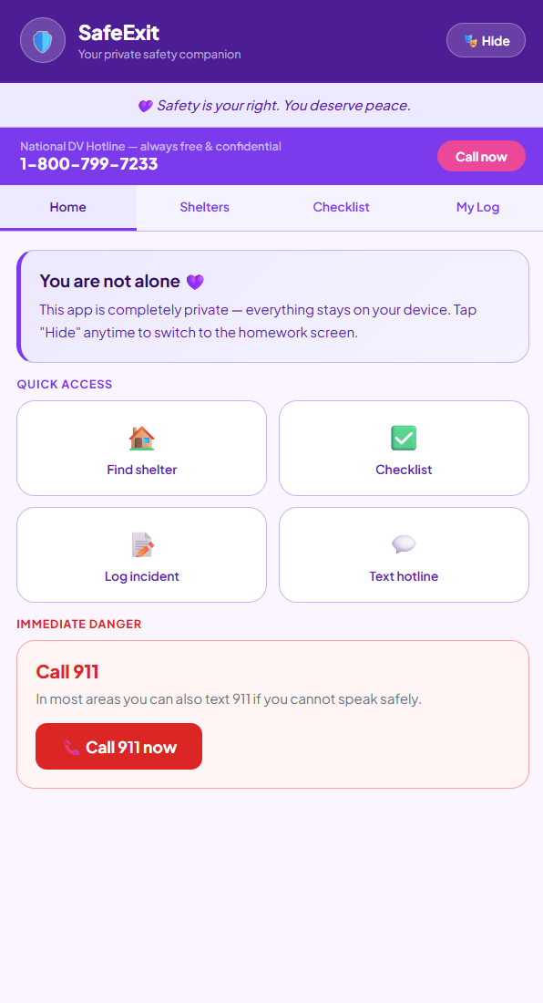 SafetyExit is a safety companion disguised as a homework planner called “StudyTrack”. Tapping a simple settings icon reveals the real app, which helps users find nearby domestic violence shelters using their current location data or zip code. It also allows them to work through an emergency escape checklist and keep a PIN-protected private incident log that never leaves a user’s device.