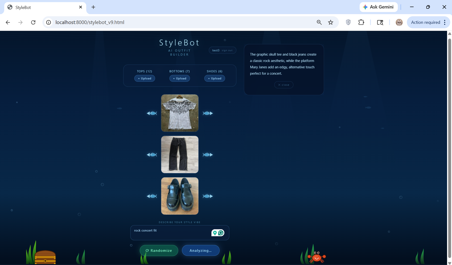 Outfit analysis is handled by the Google Gemini API, which evaluates every possible top/bottom/shoes combination and returns a structured JSON recommendation. The UI and underwater visual environment were built using the 2D Context API and assistance from Claude.