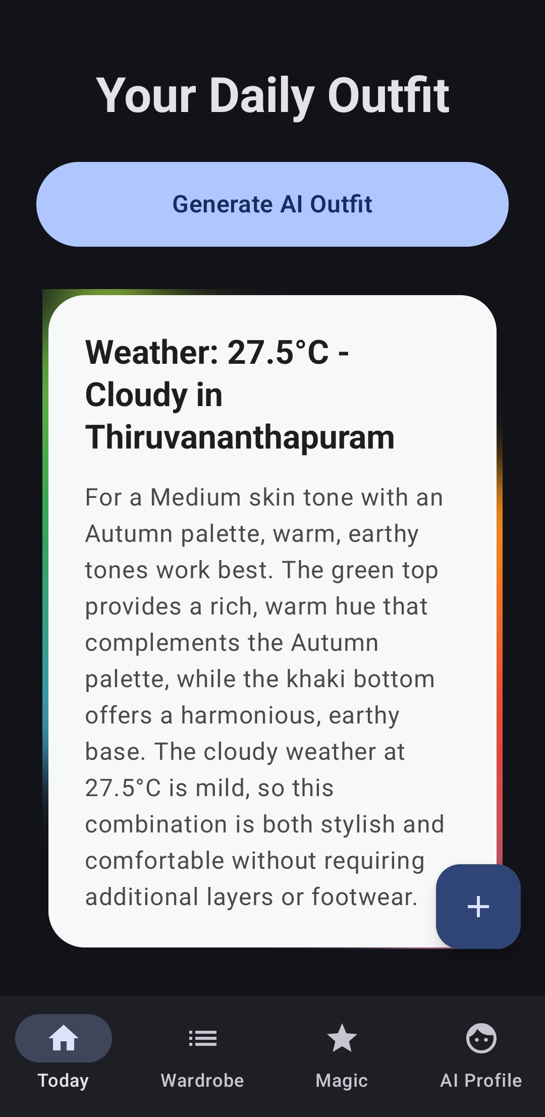 - Outfit generation – local wardrobe data plus weather and user profile are used to create a recommendation.