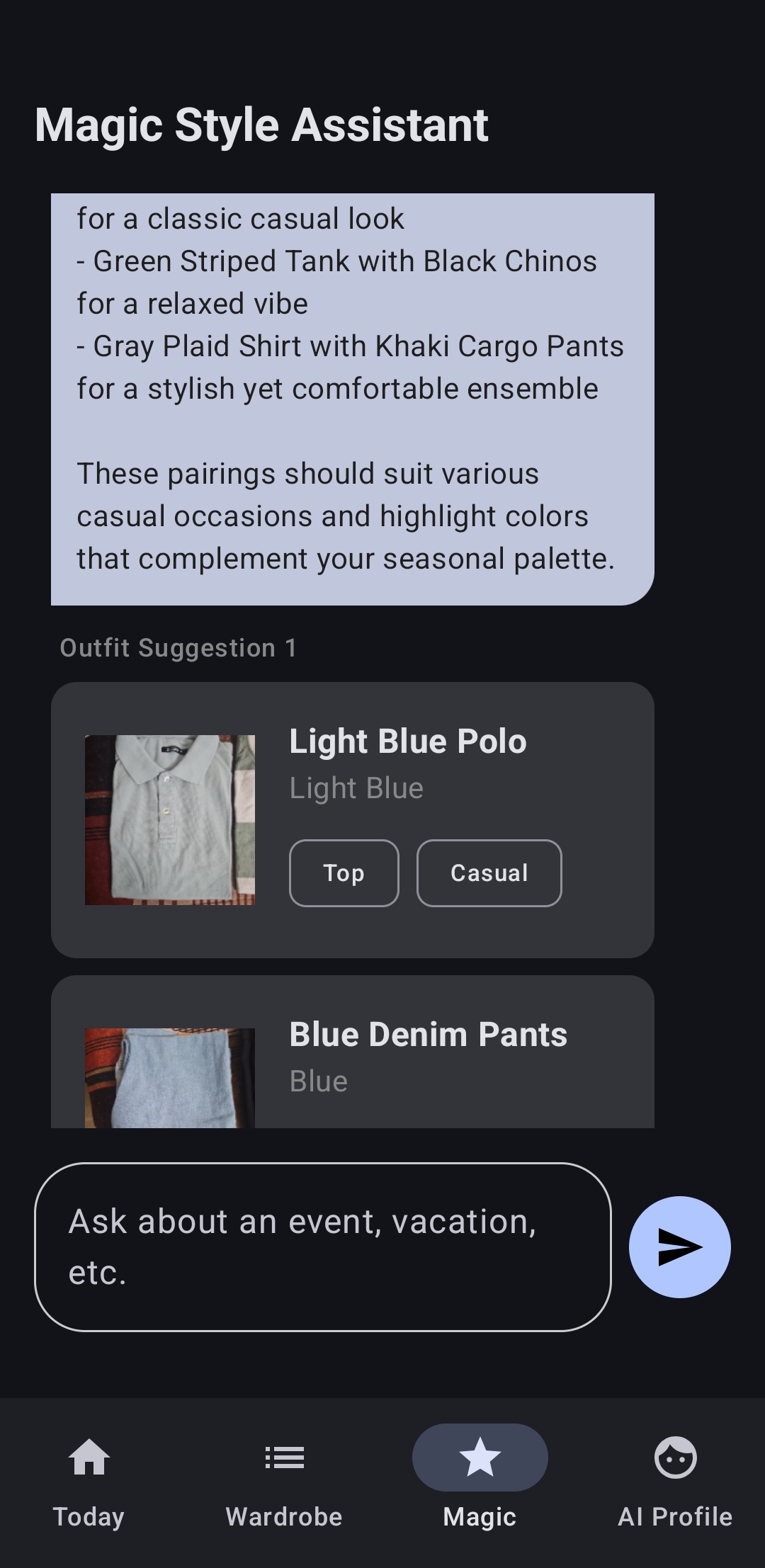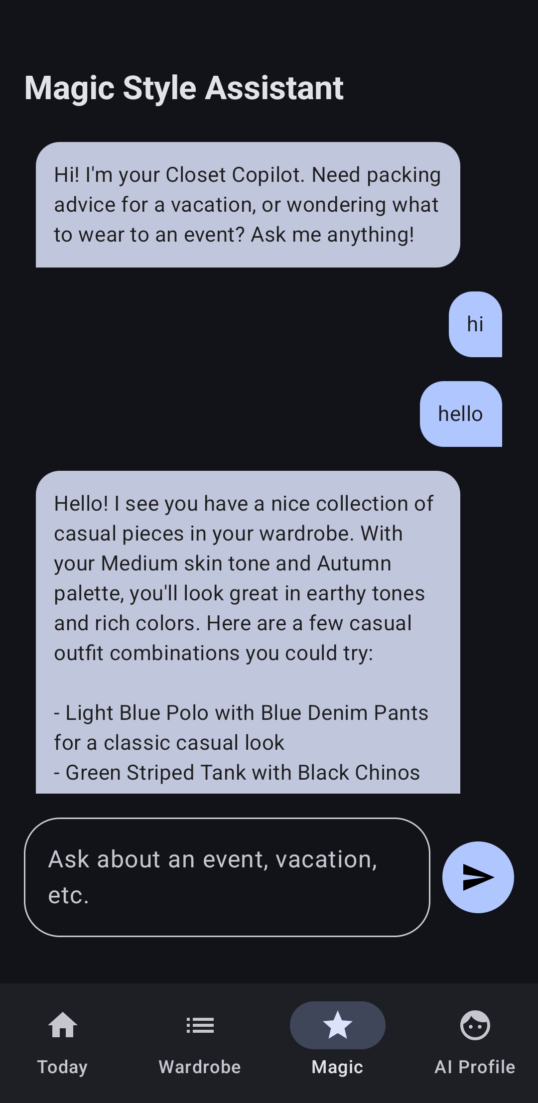 - Text chat – users can ask for styling or packing advice and receive a conversational response with optional matching outfit suggestions.