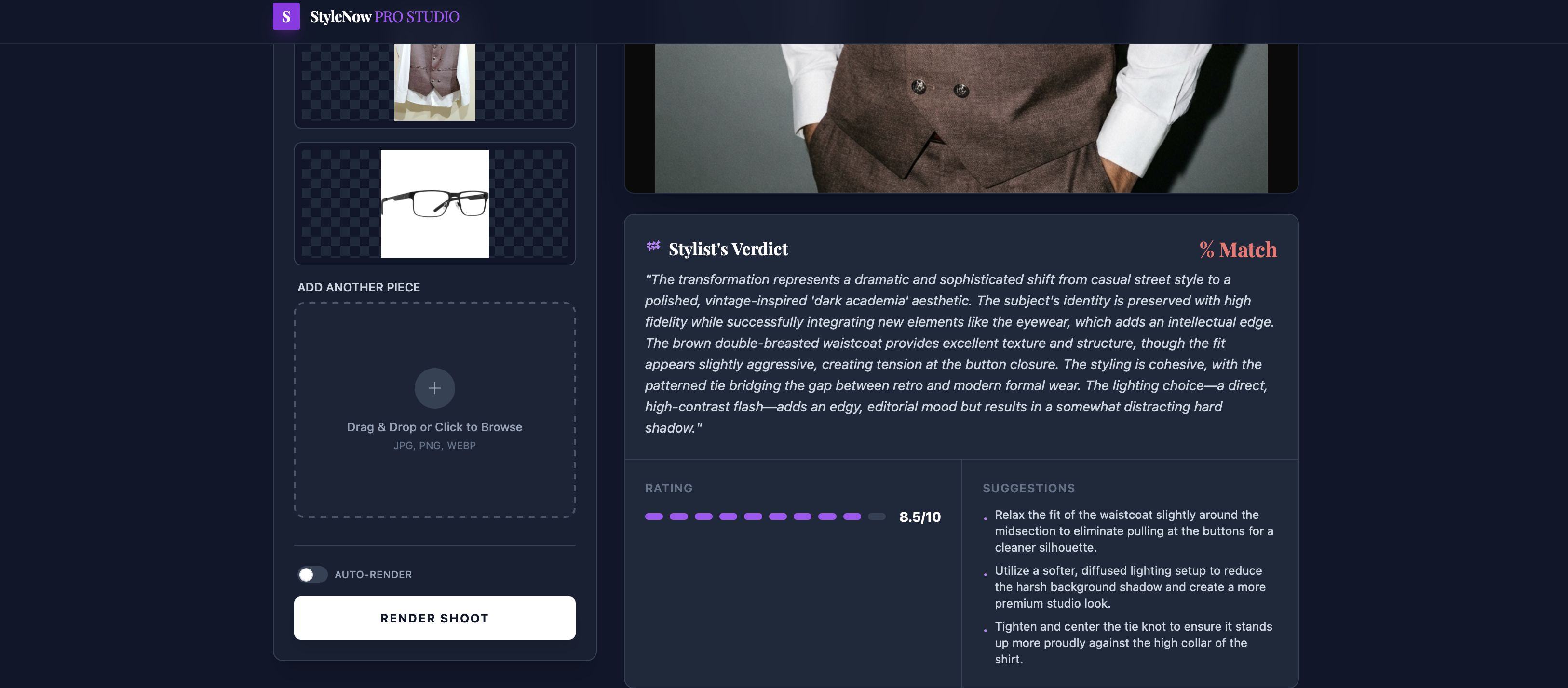 - Receive structured, AI-generated fashion critiques and numerical match scores.