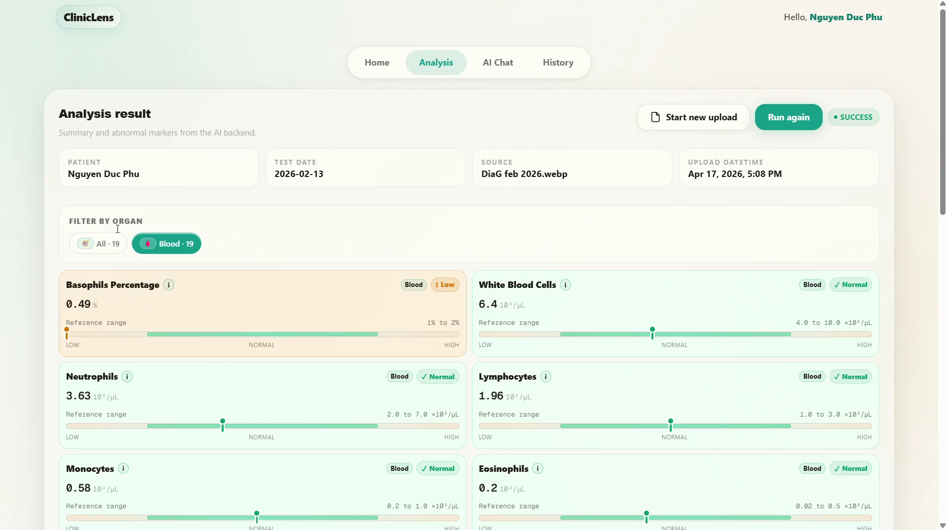 Organ-level overview - Results are grouped by organ and sorted by severity, with a summary panel showing total, abnormal, and critical counts.