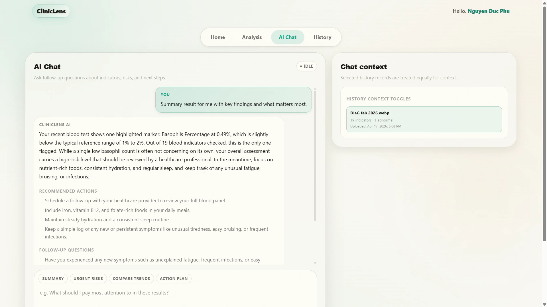 Multi-record chat context - Users can select up to 5 historical records to include as context, and the system computes a trend snapshot when the same patient has multiple analyses.